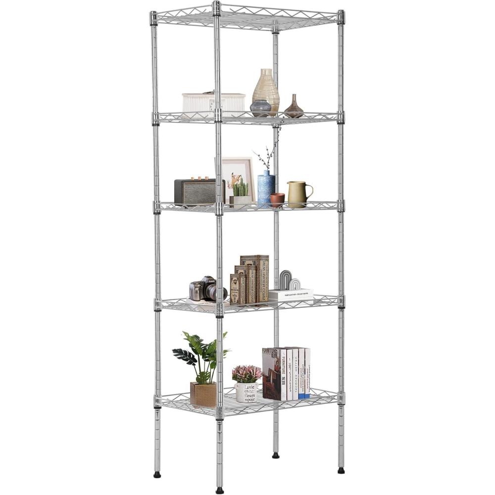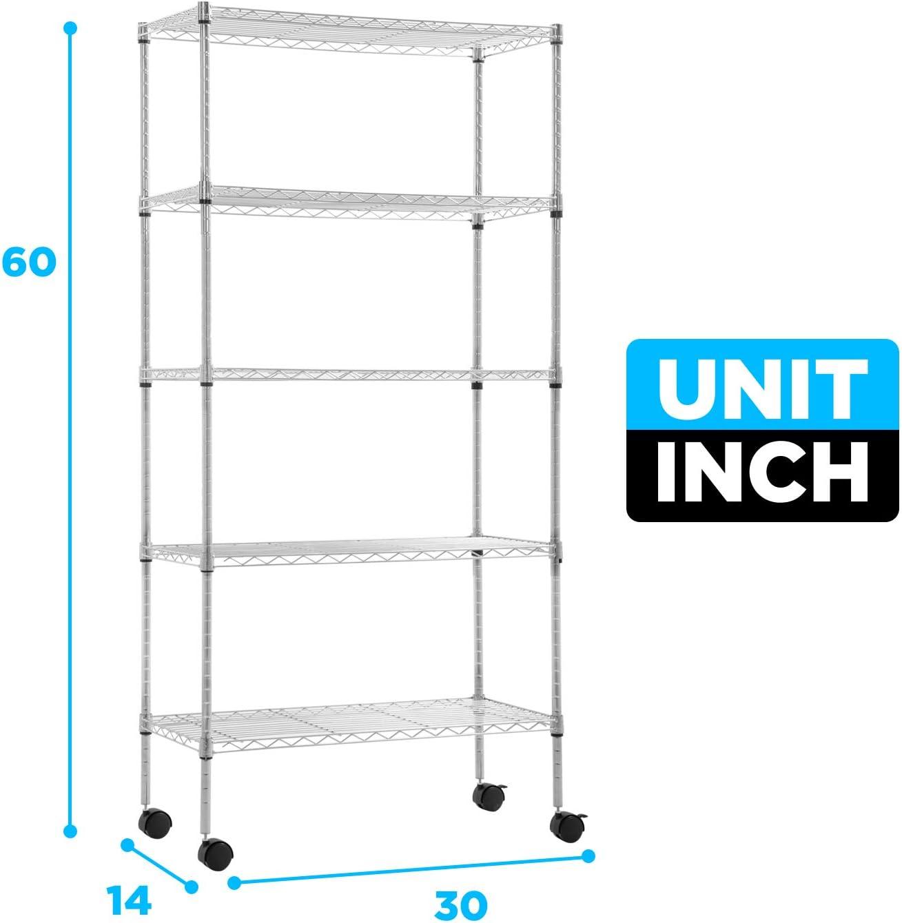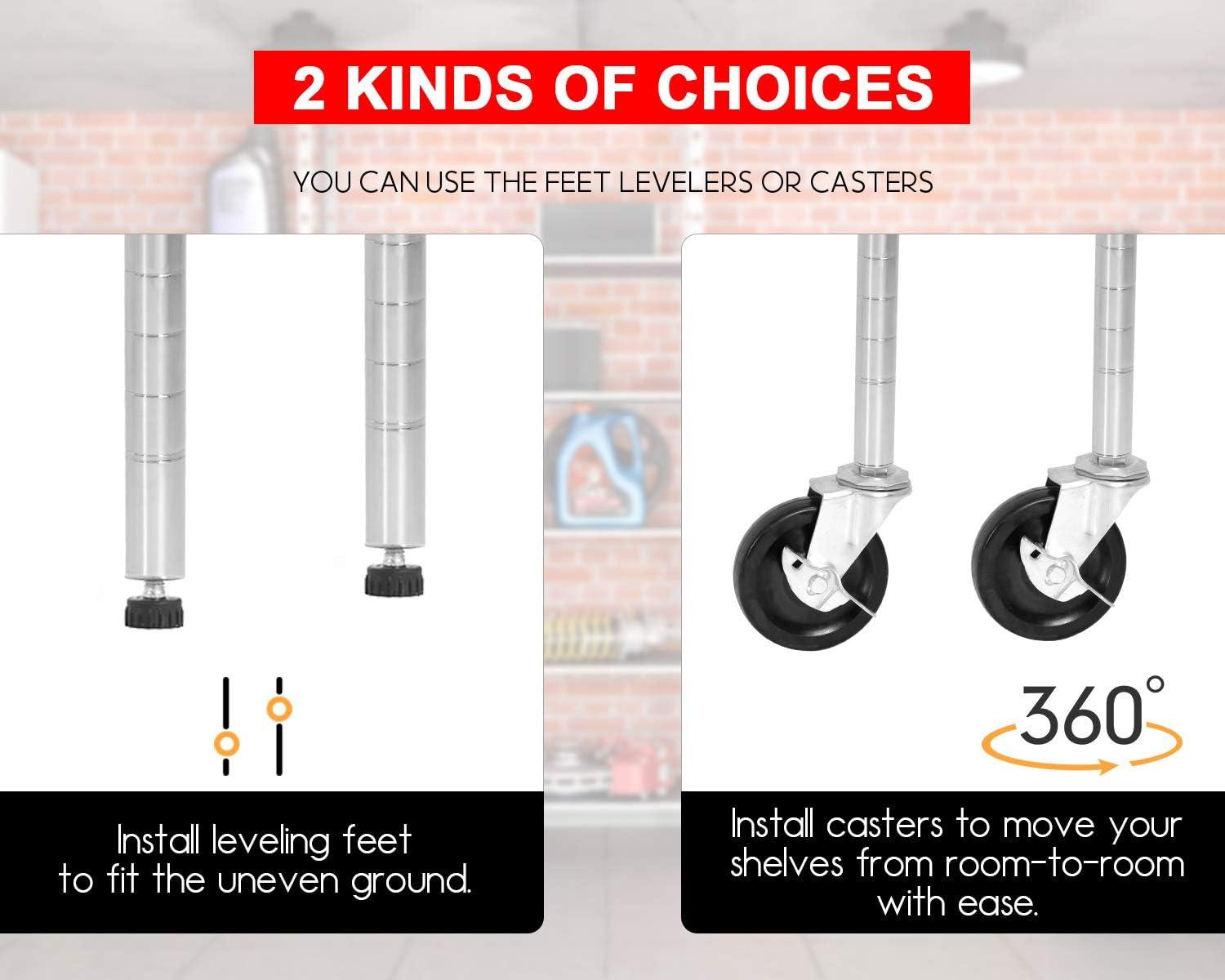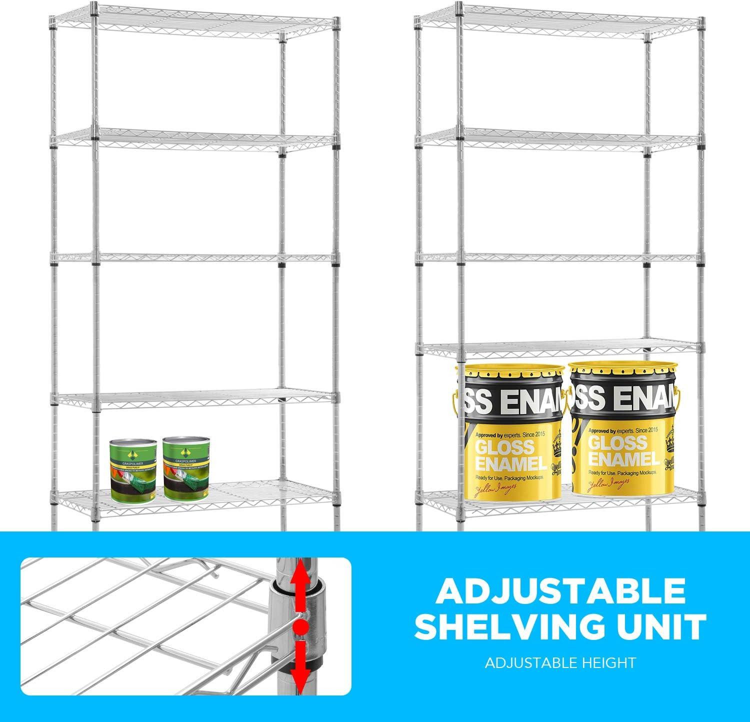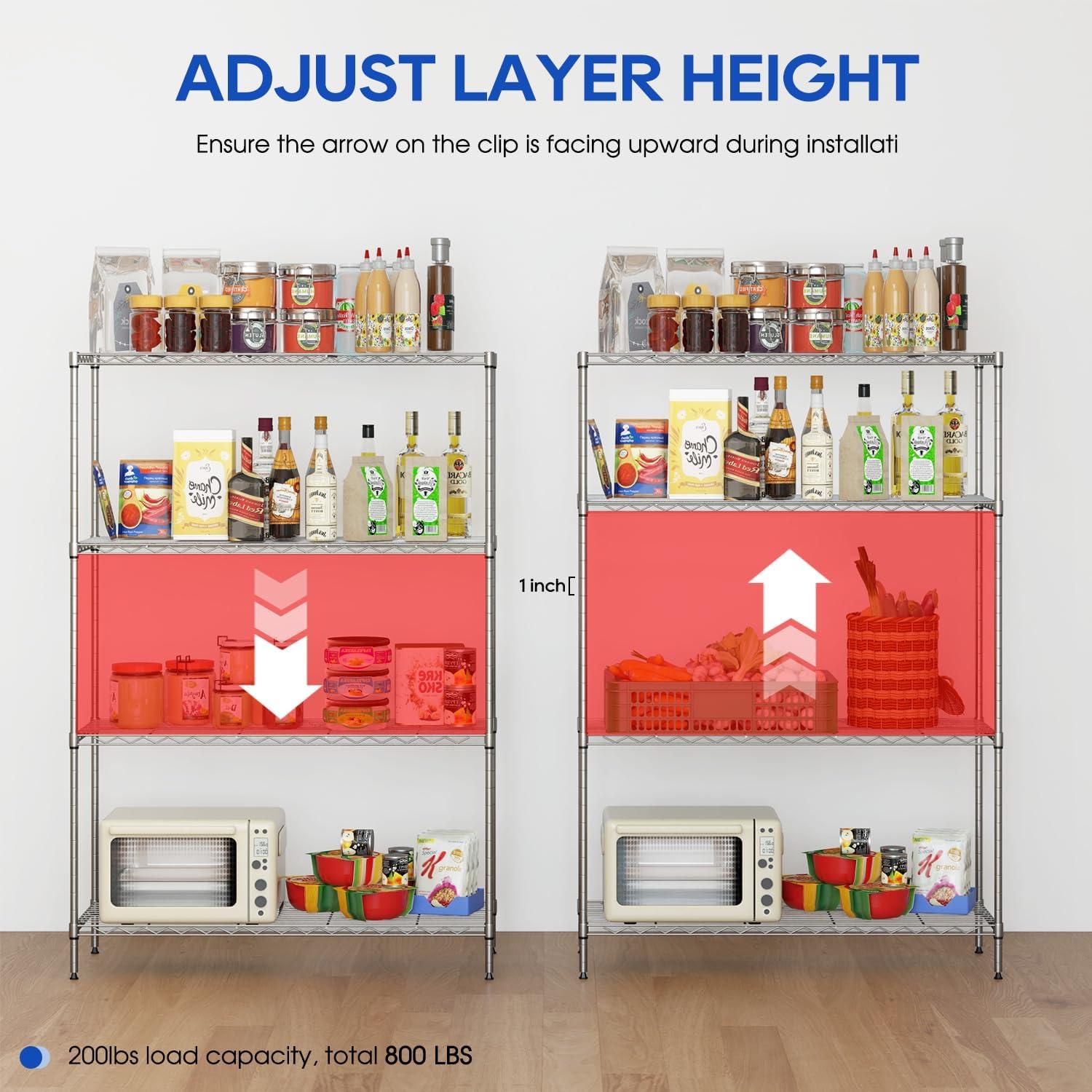 ✔【Adjustable Height】 Enjoy a completely customizable commercial metal shelving unit. The build allows for height adjustments – giving you the freedom to adjust accordingly to your needs. Comes with easy adjustable clips to secure and stabilize each shelf. The multi-purpose shelf rack is perfect for garage shelving, kitchen storage, pantry shelving, and more.