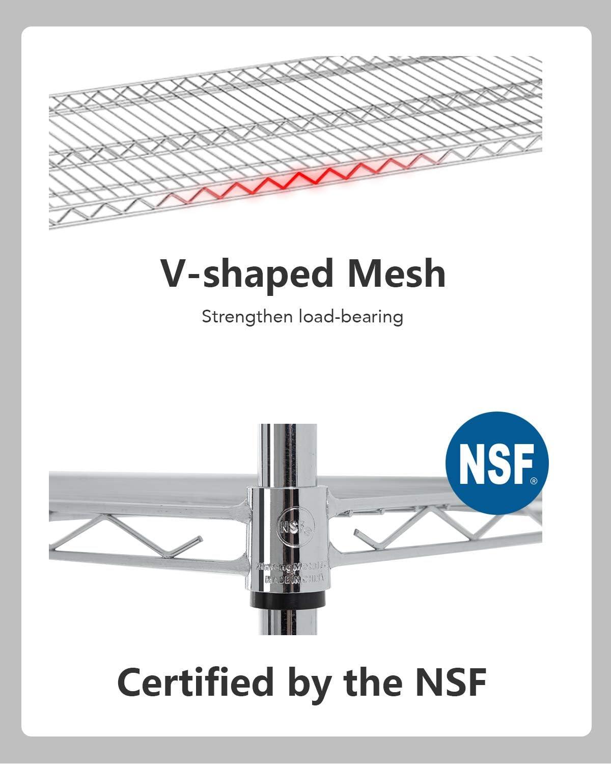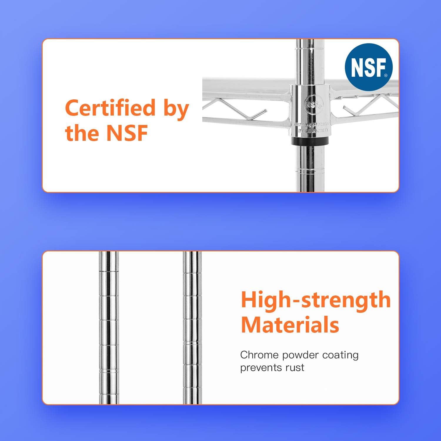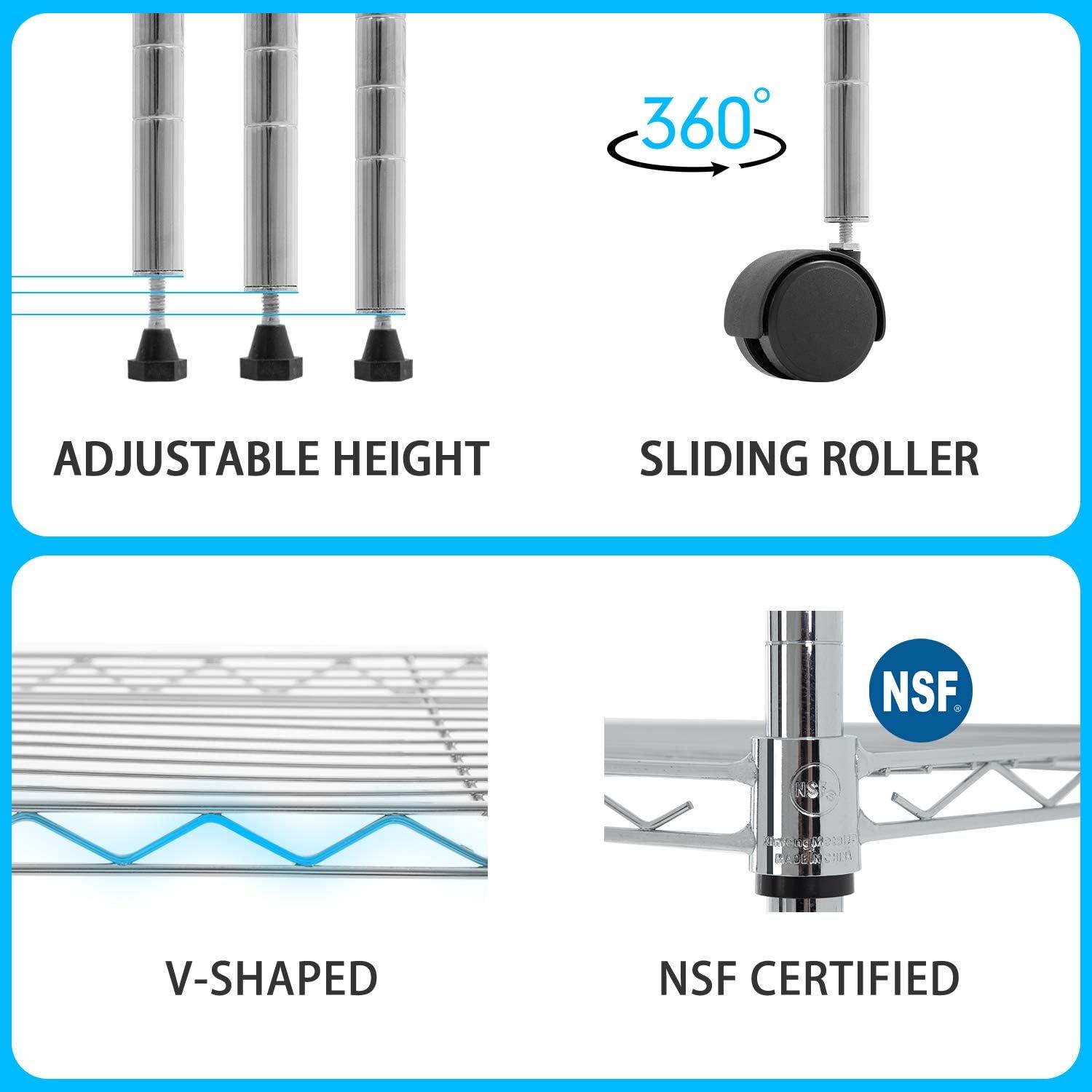 ☺【restaurant / kitchen / pantry】:Our NSF storage shelves meet sanitation requirements,they worked great as extra pantry shelving, tools, store cooking equipment, and ingredients.The adjustable shelves could fit different height of the items.Make this Wire Shelf Unit get the most out of it..