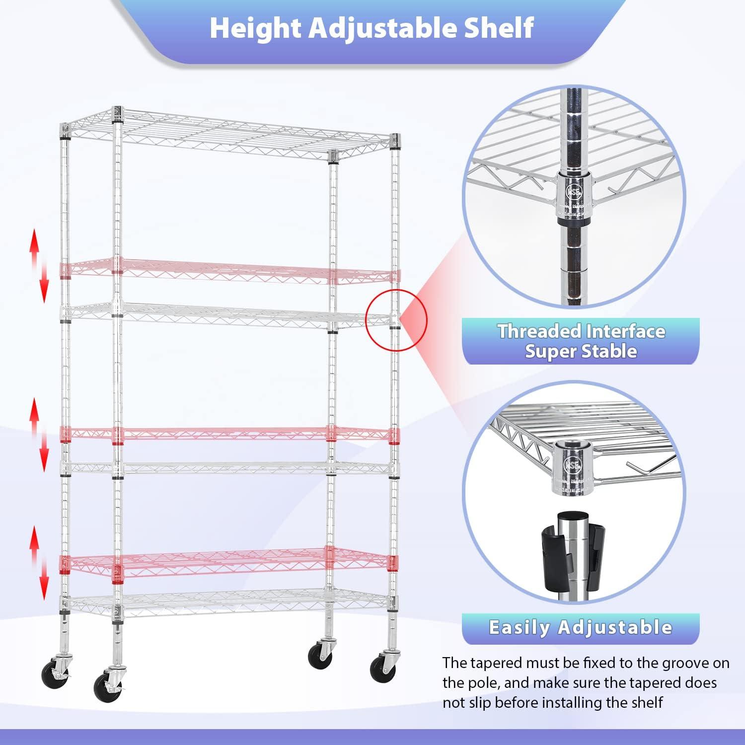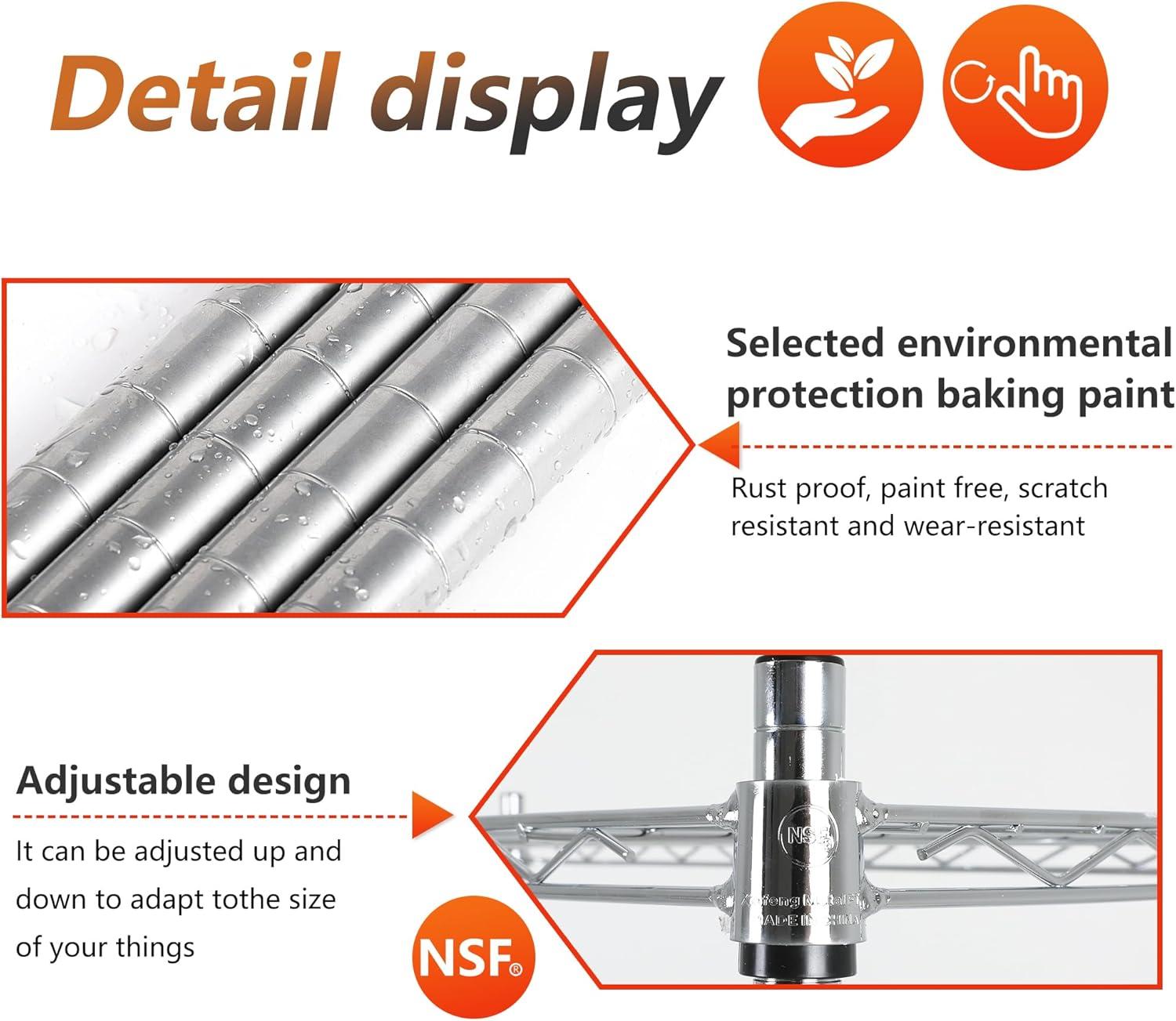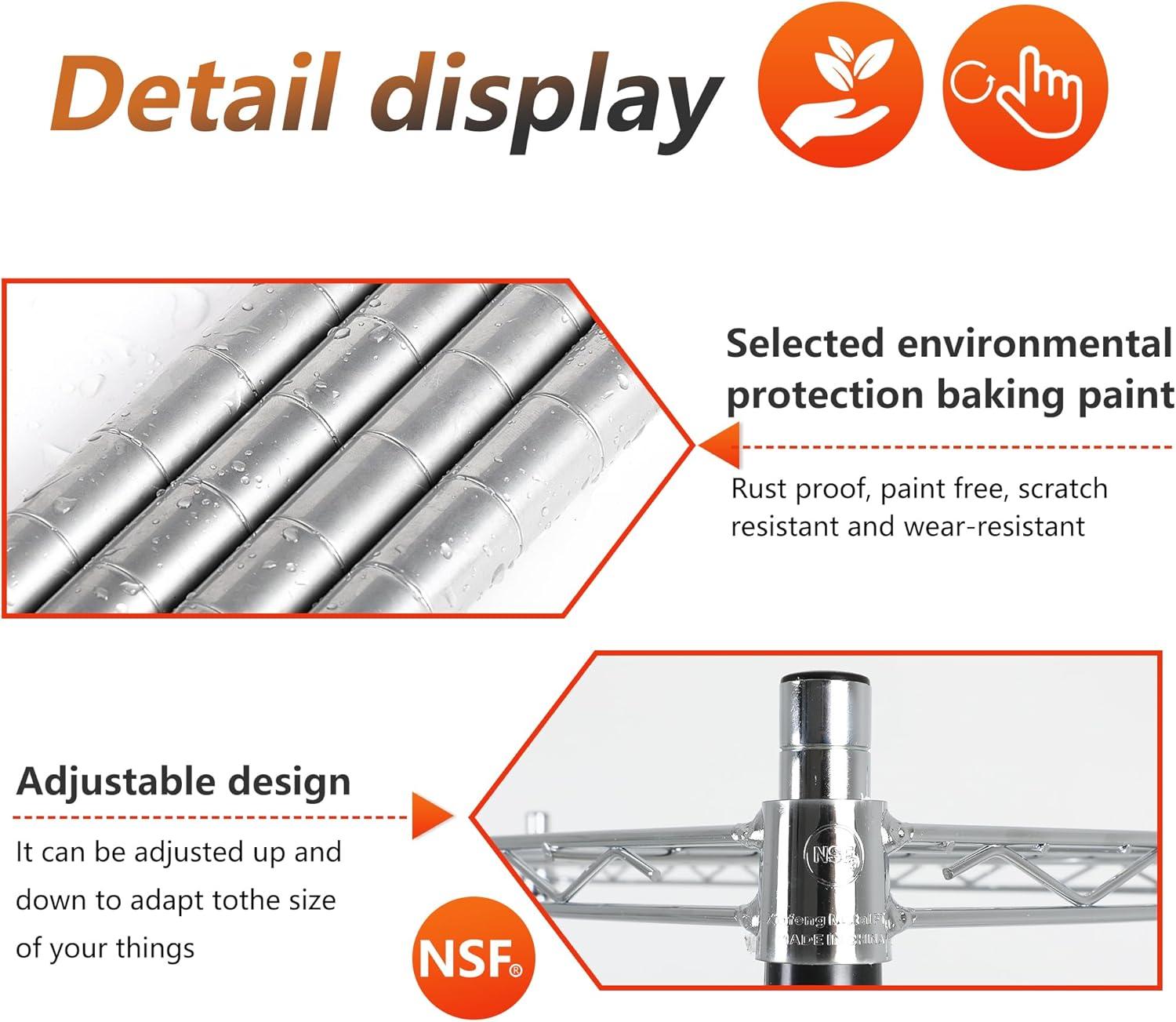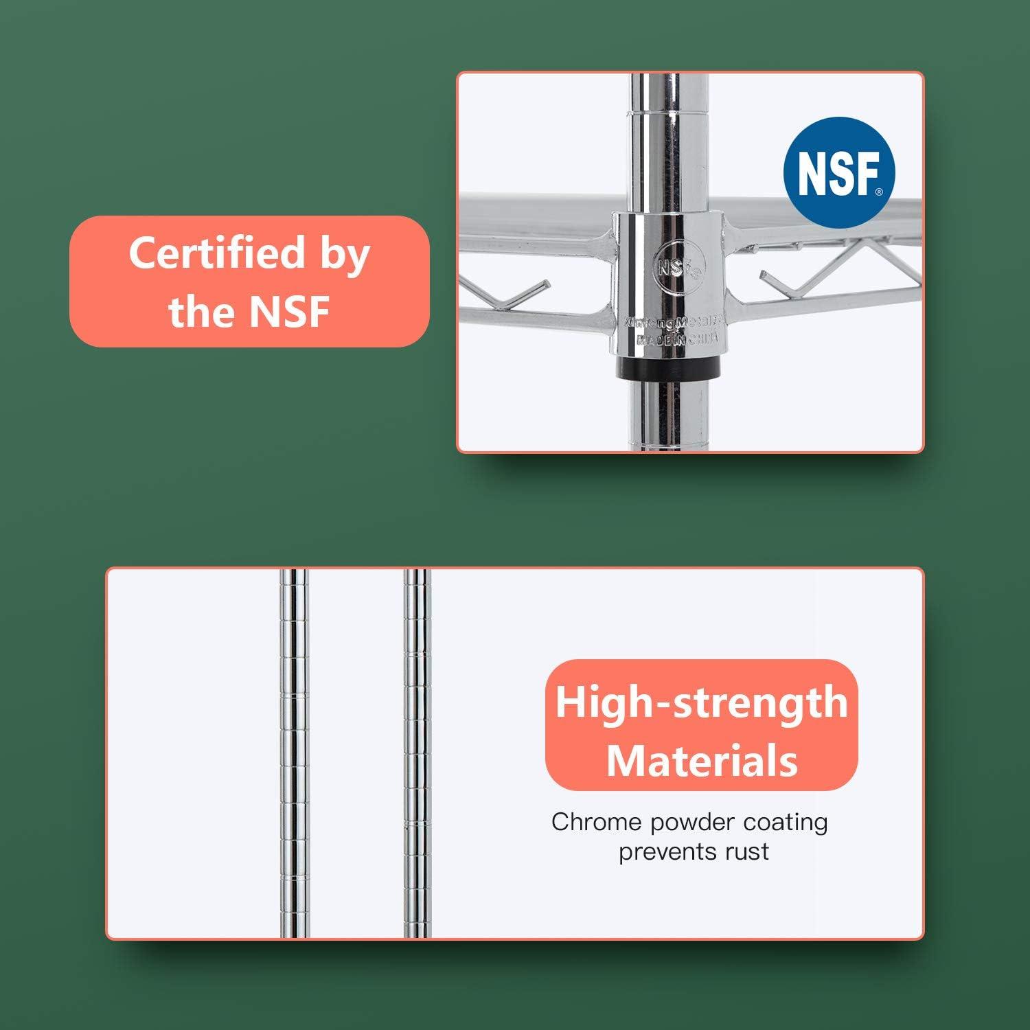☺【restaurant / kitchen / pantry】:Our NSF storage shelves meet sanitation requirements,they worked great as extra pantry shelving, tools, store cooking equipment, and ingredients.The adjustable shelves could fit different height of the items.Make this Wire Shelf Unit get the most out of it..