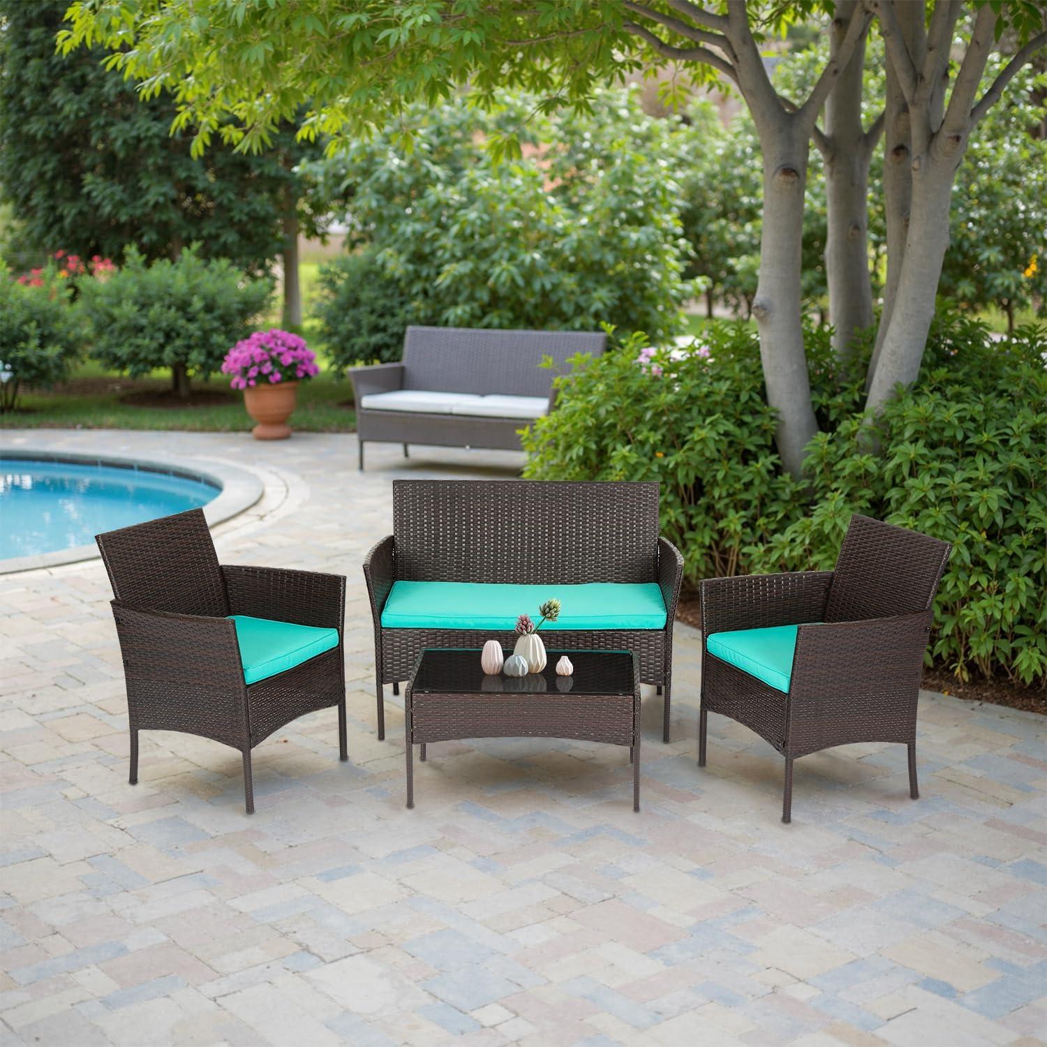 FDW | 4-Piece Patio Furniture Set | Gray & Khakhi | Outdoor Wicker Furniture with Coffee Table | Modern Rattan Chairs Conversation Set | Outdoor Seating | Weather-Resistant | for Porch, Garden, Lawn(Brown and Blue)