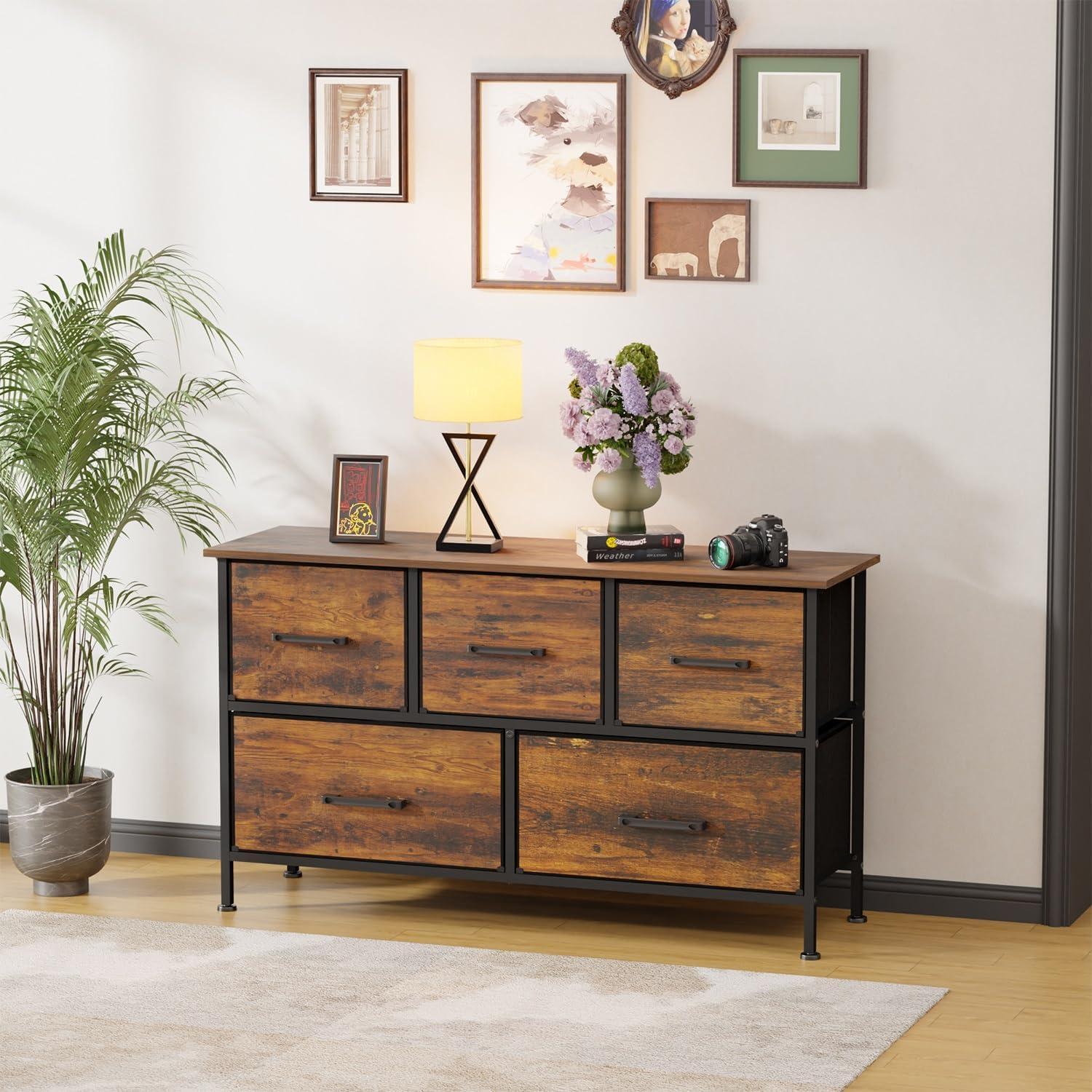FDW 5 Fabric Drawers Dresser for Bedroom,Chest Organizer Units with Steel Frame and Wooden Top for Bedroom,Closet,Living Room, Entryway,Brown(Brown)
