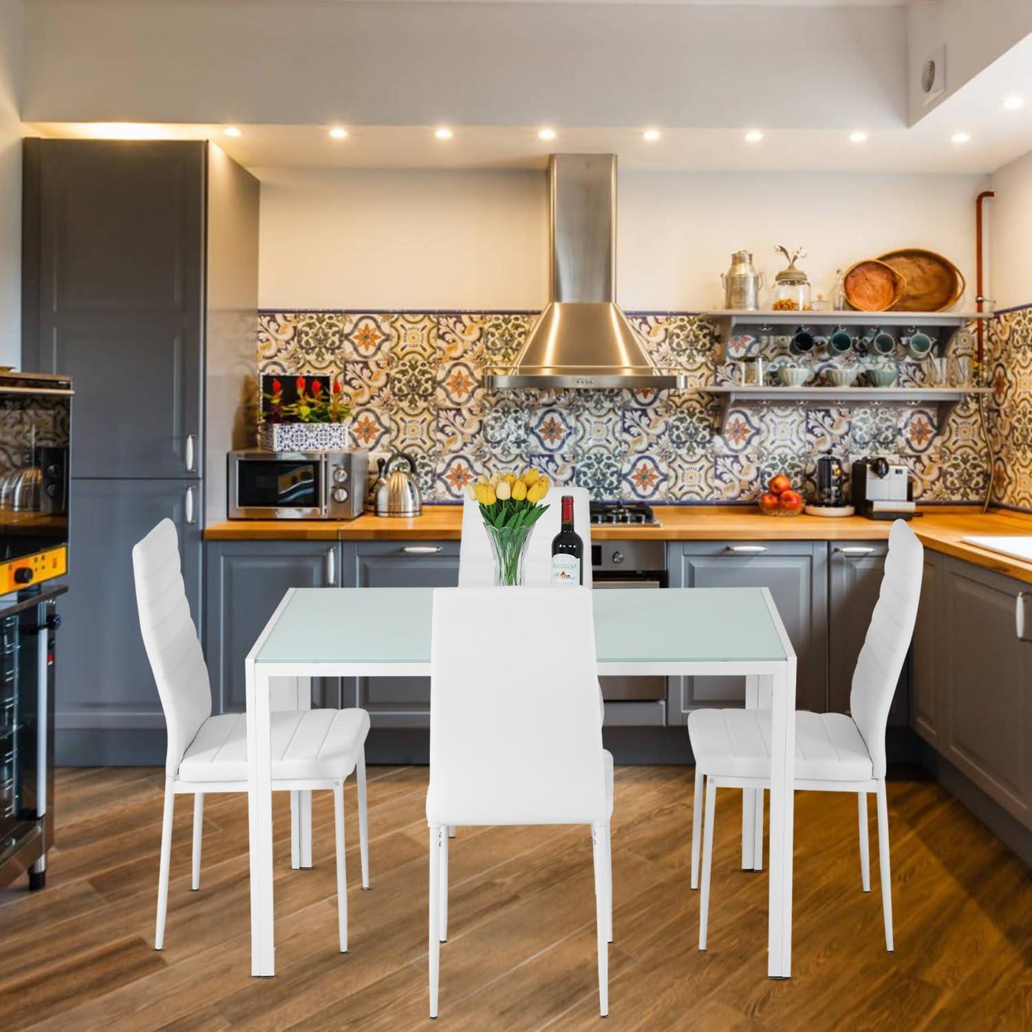 UPGRADED COMFORT: This 5-piece dining set includes a rectangular glass kitchen table and 4 faux leather chairs with cushioned seats, offering comfort and support for everyday meals.