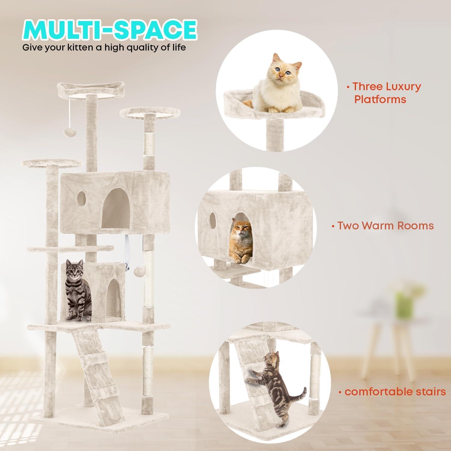 🐱 【Multifunctional Activity Center】The cat Tree provides 3 top perches platforms and two cozy condo. Whether your kitten wants to stretch out on a spacious perch, curl up in a plush hole room, or release the urge to scratch on a sisal pole, this multifunctional cat tree tower works perfectly as a recreation paradise,which can make your fur baby's day full of fun and excitement!two toys gives them a unique way and Fun to play!
