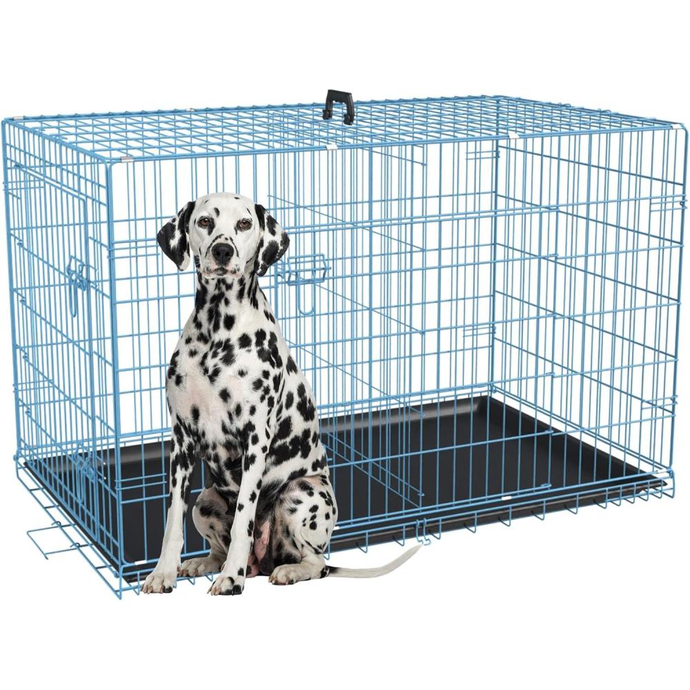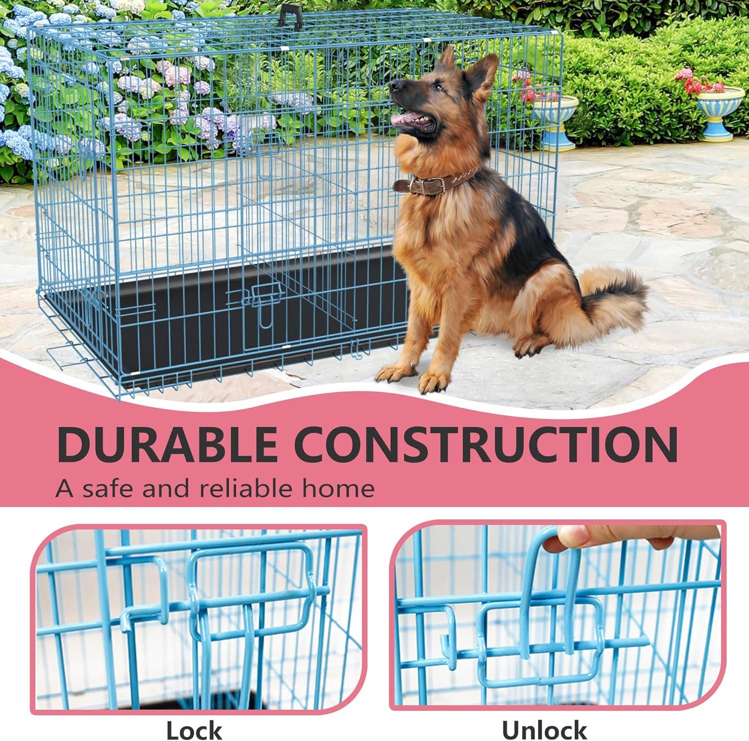 FDW Dog Crate for Large Dogs 48 Inch Folding Metal WirePet Cage Double Door W/Divider Panel Indoor Outdoor Kennel Leak-Proof Plastic Tray,Blue