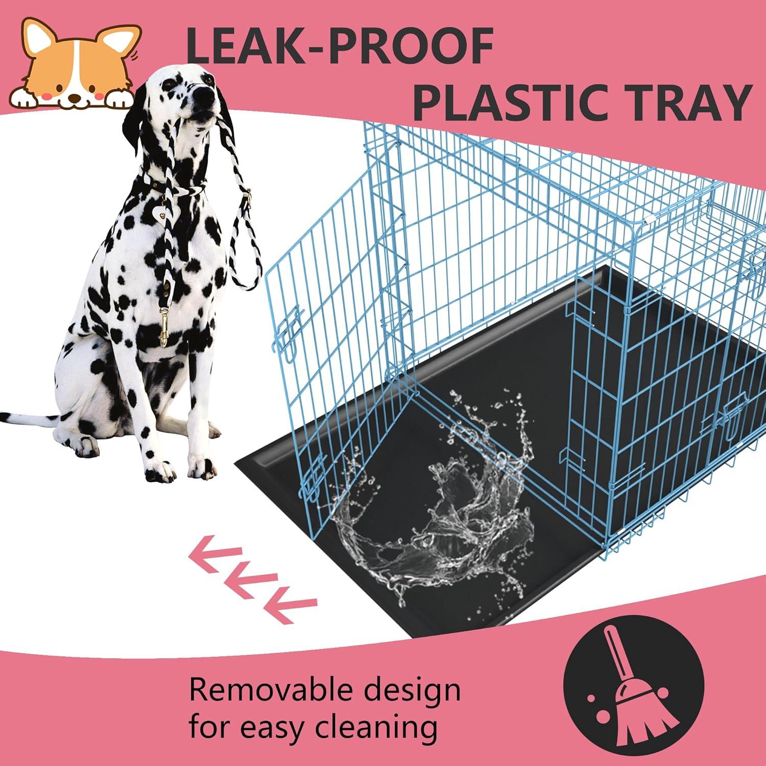 【Leak-Proof Plastic Tray】This dog crate features a detachable, leak-proof plastic tray that runs the length of the crate, making cleanup simple in the event of an accident. For dog dishes that won't slip, look for a textured surface.Dog cage dog crate dog kennel