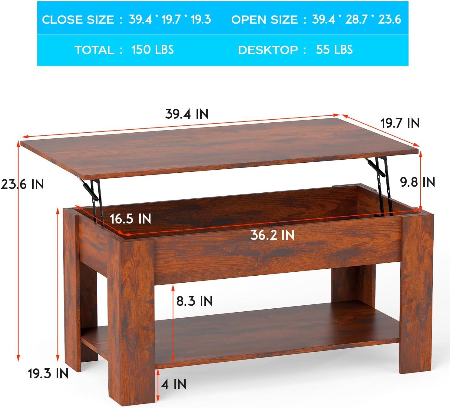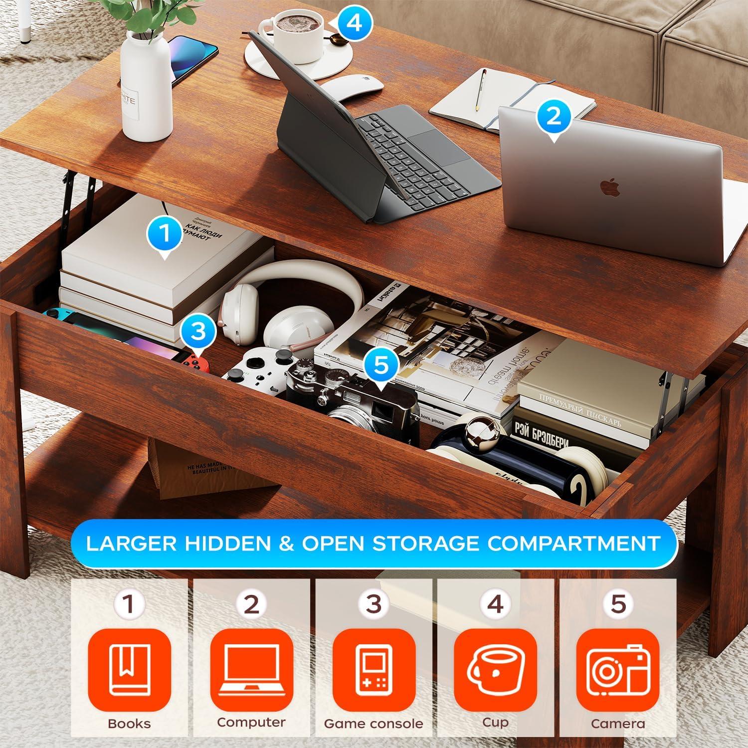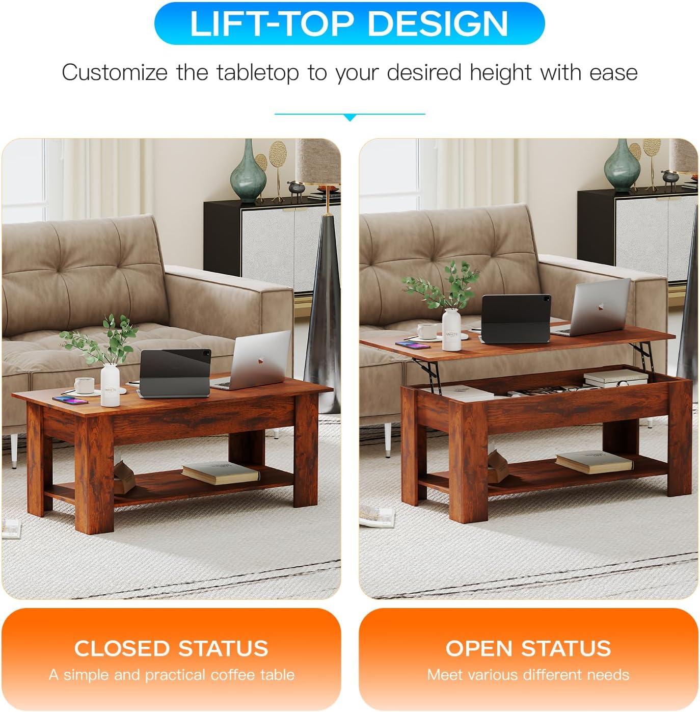 FDW Lift Top Coffee Table with Hidden Compartment and Storage Shelf Wooden Lift Tabletop for Home Living Room Reception Room Office,39.4",Brown(Dark Brown)