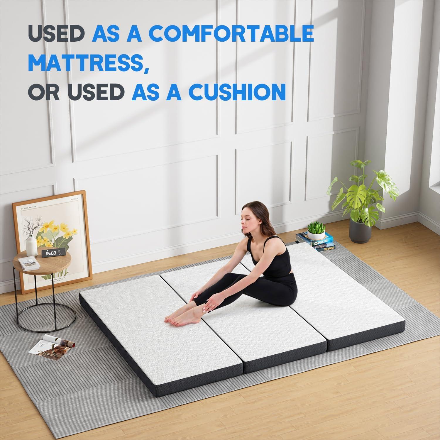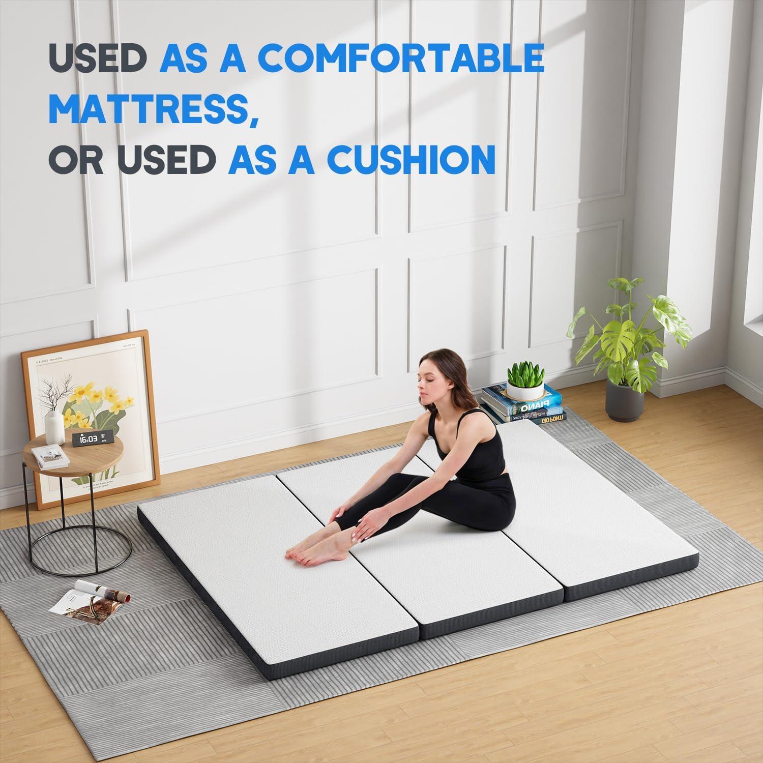 Multi functional triple fold mattress:FDW triple fold mattress adopts double-layer foam structure, knitted breathable fabric and anti-skid bottom design. It can be easily unfolded for use as a comfortable mattress, or folded up for use as a cushion. It is very suitable for camping, RV travel, or use on the floor.