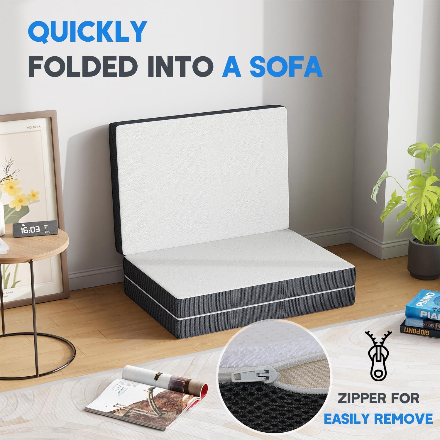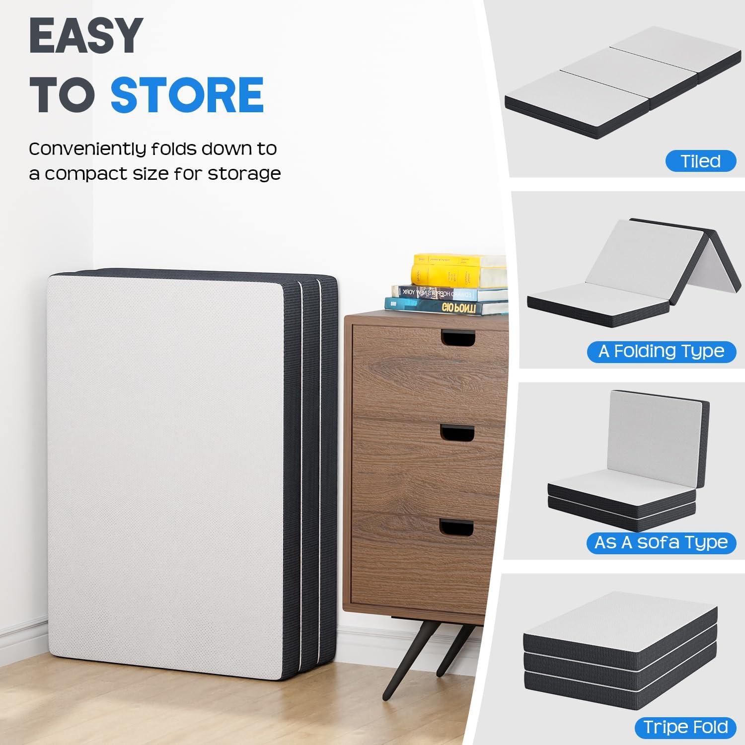 High quality Material:FDW's three fold mattress provides high-quality elasticity, providing comfortable support for your body. The gel memory foam keeps you cool all night long, reduces body pressure, and provides additional comfort and ergonomic support with a medium hardness touch. High quality materials and high-density foam ensure its service life. This mattress combines comfort, durability, and convenience, making it the ideal choice for anyone.