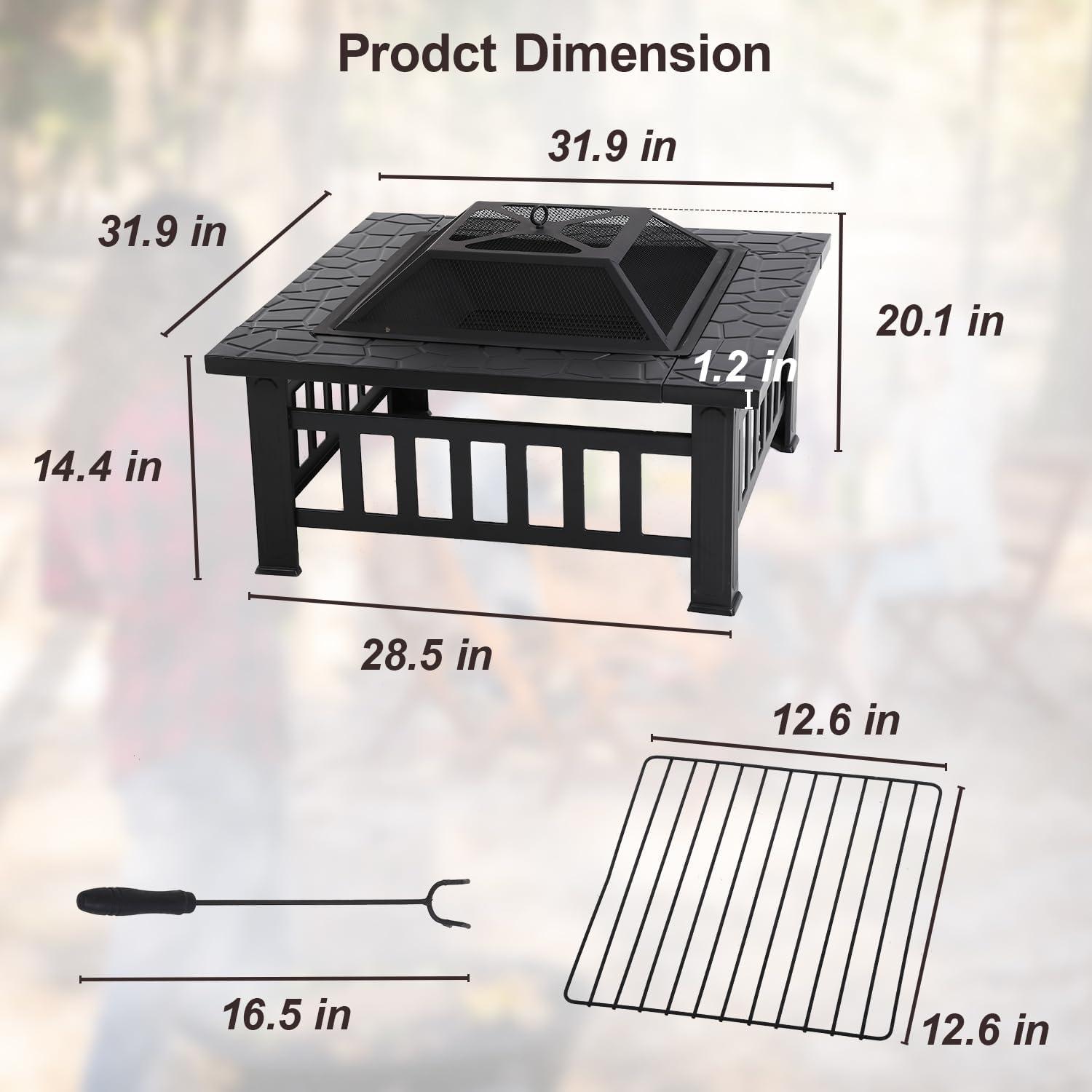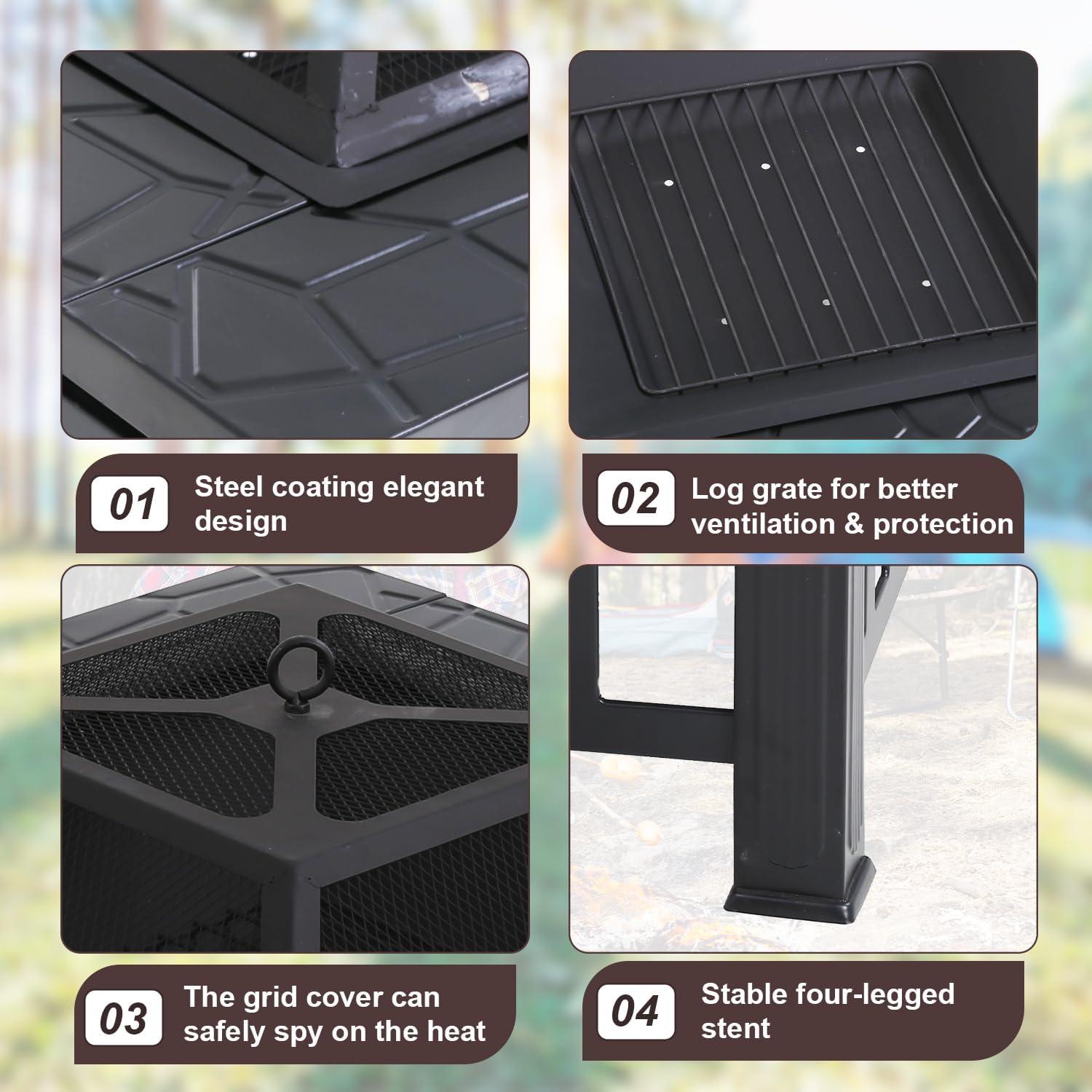 Durable Construction: Built with a robust metal frame, this fire pit ensures long-lasting performance and stability for all your outdoor occasions. The rust-resistant coating keeps it looking elegant and protects against weather elements, and ideal for year-round use. Its sleek square design adds a touch of modern charm to any outdoor setting, blending functionality with style.