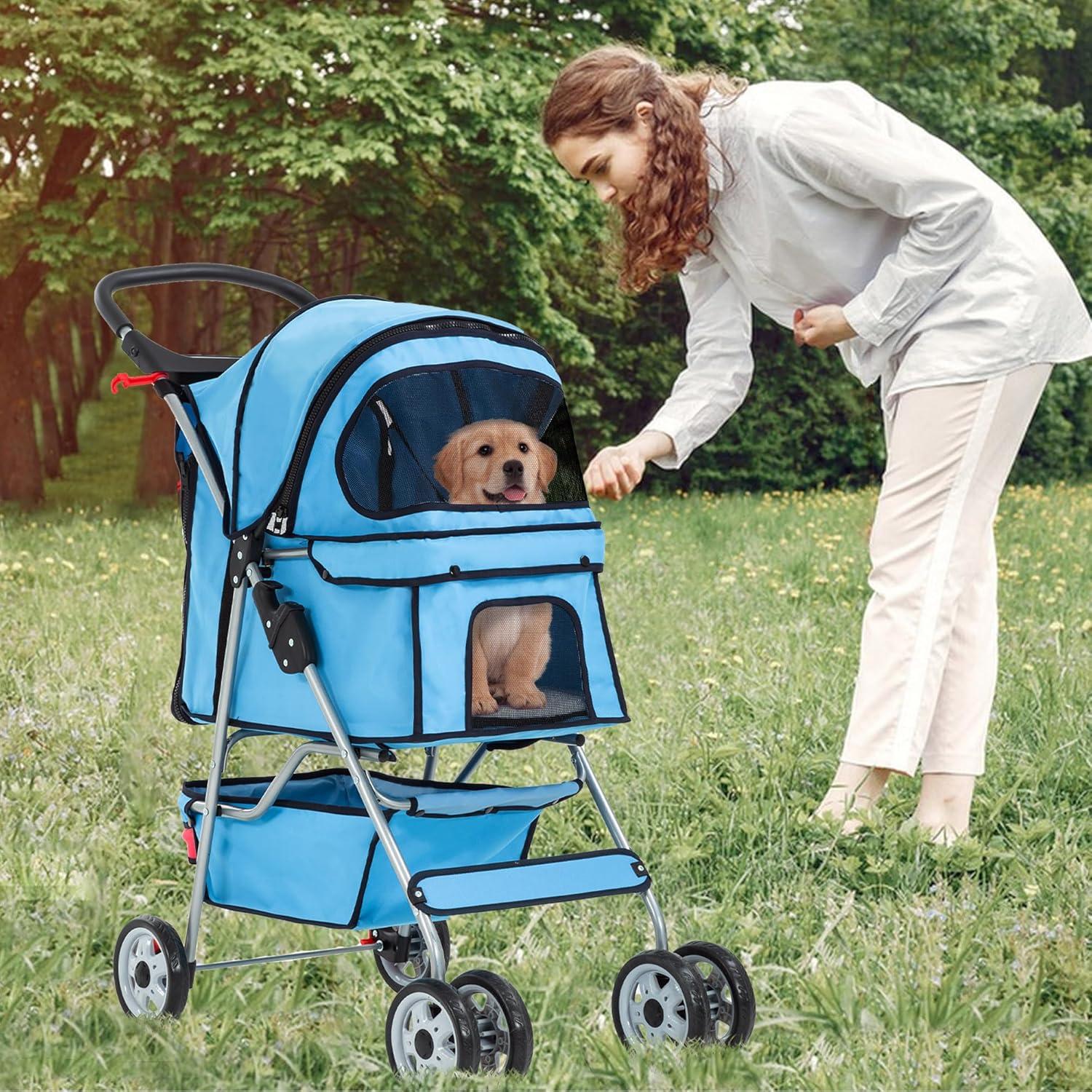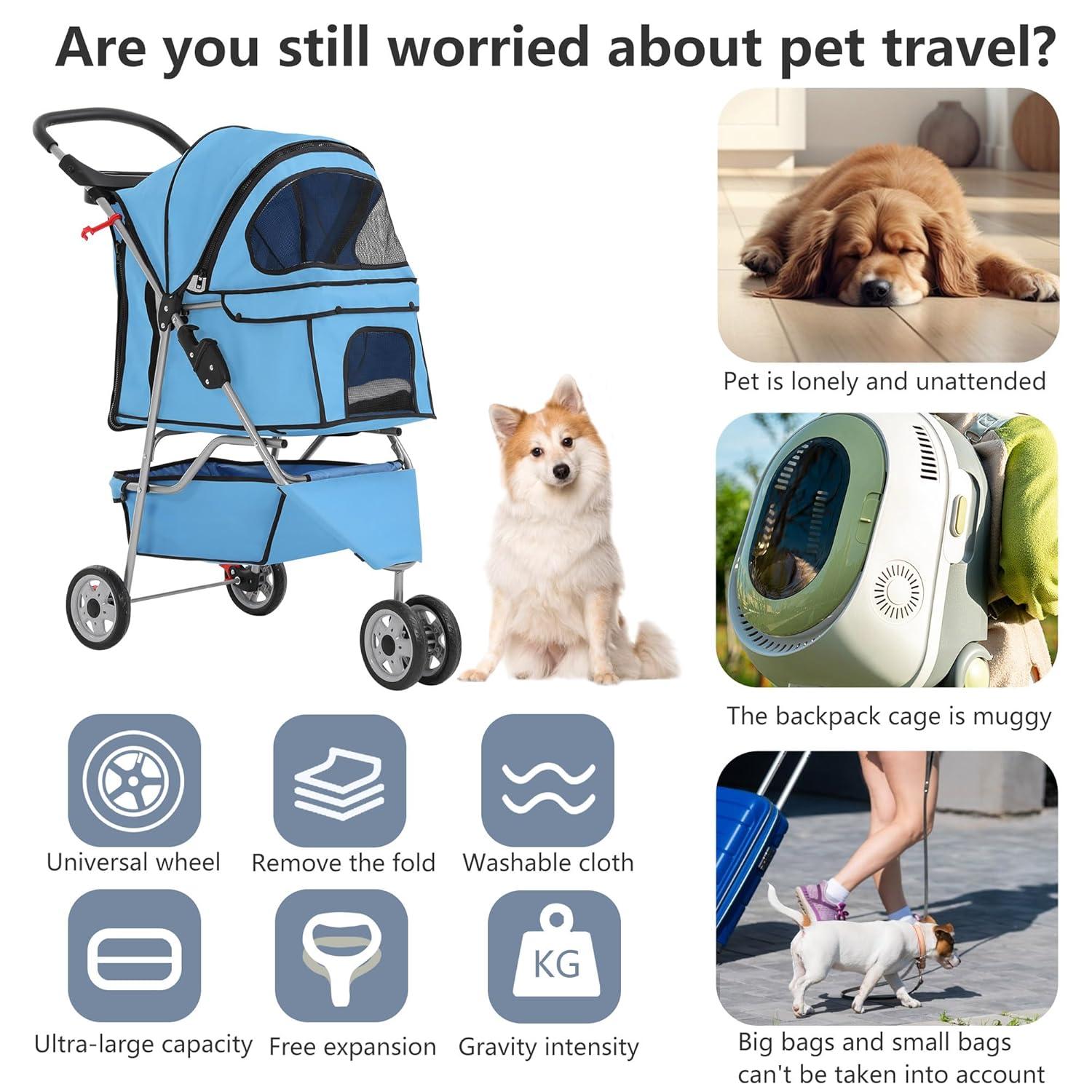 FDW Pet Stroller 3-Wheel Durable Foldable Cat Dog Stroller with Washable Liner Storage Basket Cup Holder,Purple(Blue)