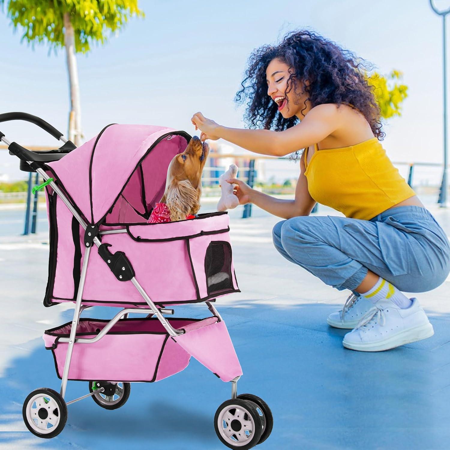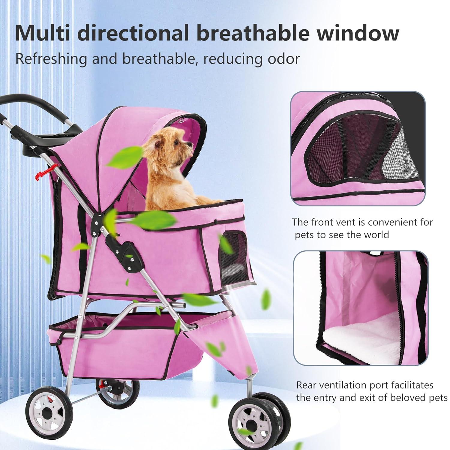 FDW Pet Stroller 3-Wheel Durable Foldable Cat Dog Stroller with Washable Liner Storage Basket Cup Holder,Purple(Pink)