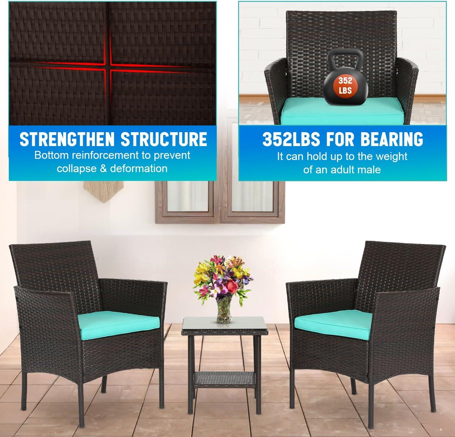 FDW Wicker Outdoor Furniture Patio Furniture Set of 3 Rattan Patio Chairs Outdoor Chairs Patio Conversation Set with Coffee Table for Yard Backyard Lawn Porch Poolside Balcony,Black(Brown and Blue)