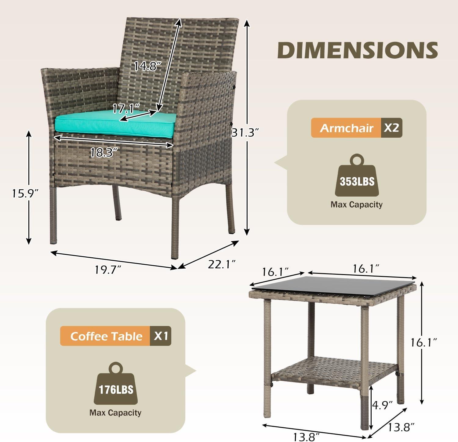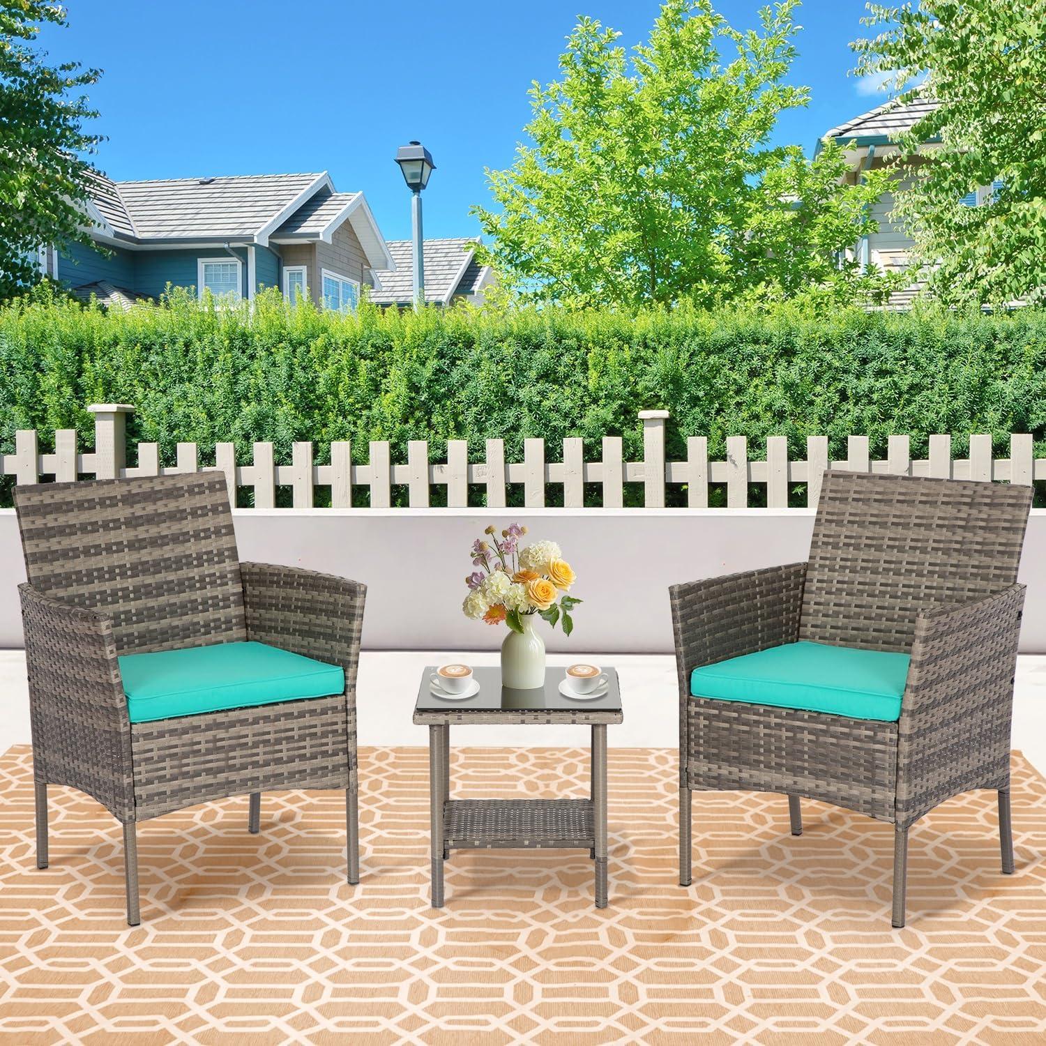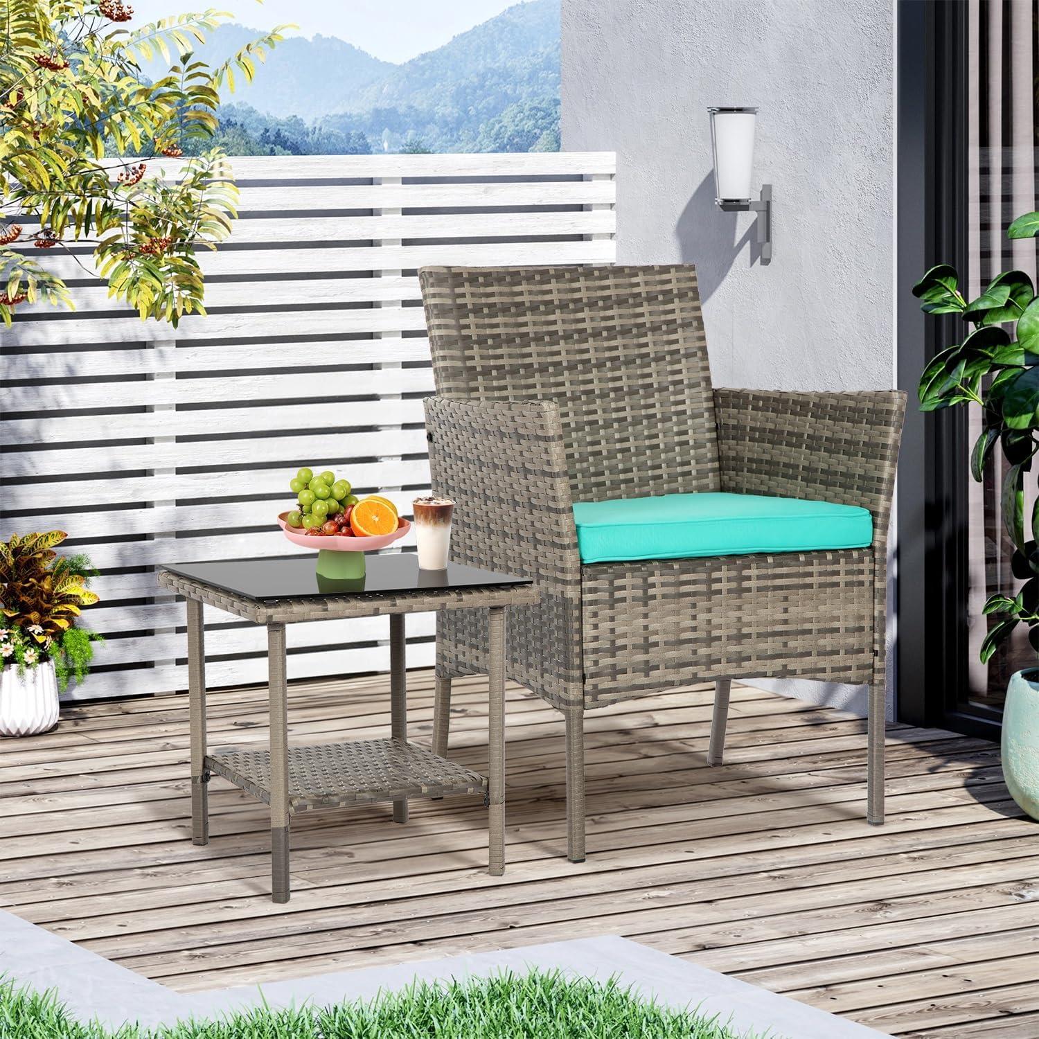 FDW Wicker Outdoor Furniture Patio Furniture Set of 3 Rattan Patio Chairs Outdoor Chairs Patio Conversation Set with Coffee Table for Yard Backyard Lawn Porch Poolside Balcony,Black(Gray and Blue)