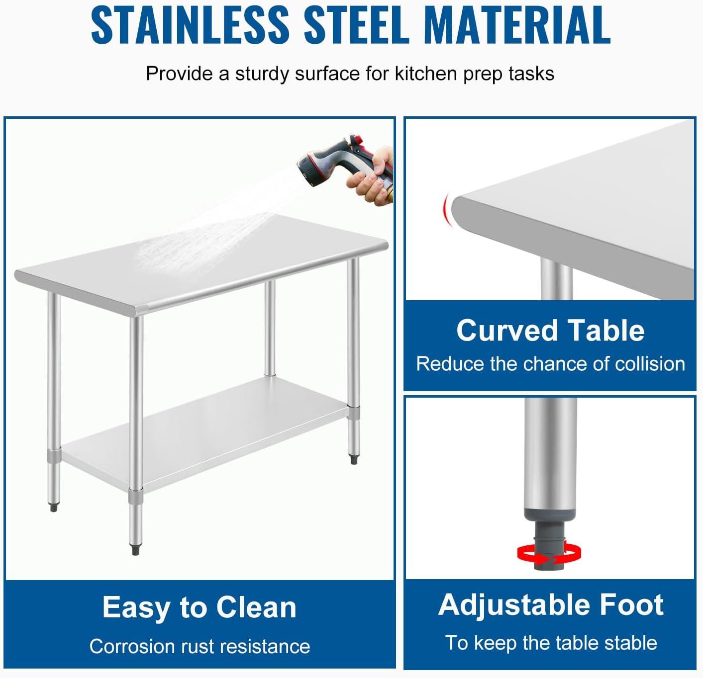 ✨High Quality Material-Our kitchen work table is made of high quality stainless steel, anti-rust, and not easy to wear and tear.Easy to clean and sterilize, Using rag or paper you can easily clean it quickly.Metal prep station tables are superior to wood or glass.