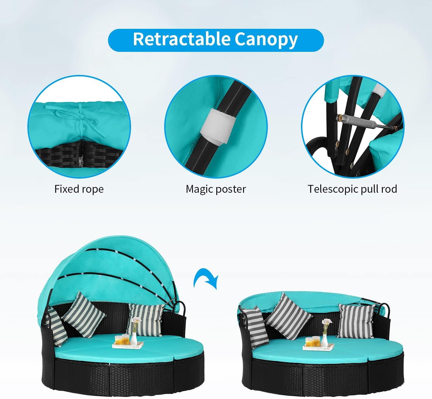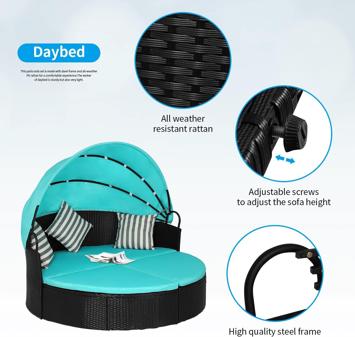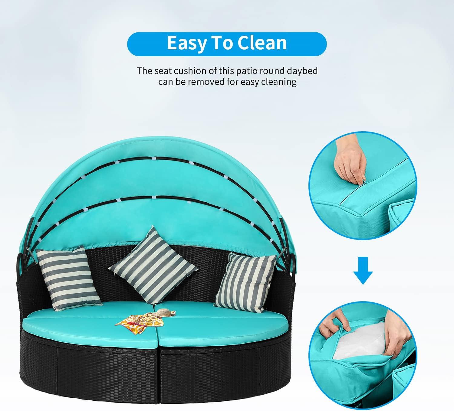 ♥【UPGRADED COMFORT】-The patio furniture set with telescopic pull rod that provide adjustable canopy. You can enjoy a sun bath in the warm sunshine when closing the canopy or enjoy a cool in the hot weather when opening the canopy.This rattan daybed comes with generous sized thick padded seat cushions and back cushions.The seat cushion of this patio round daybed can be removed for easy cleaning.