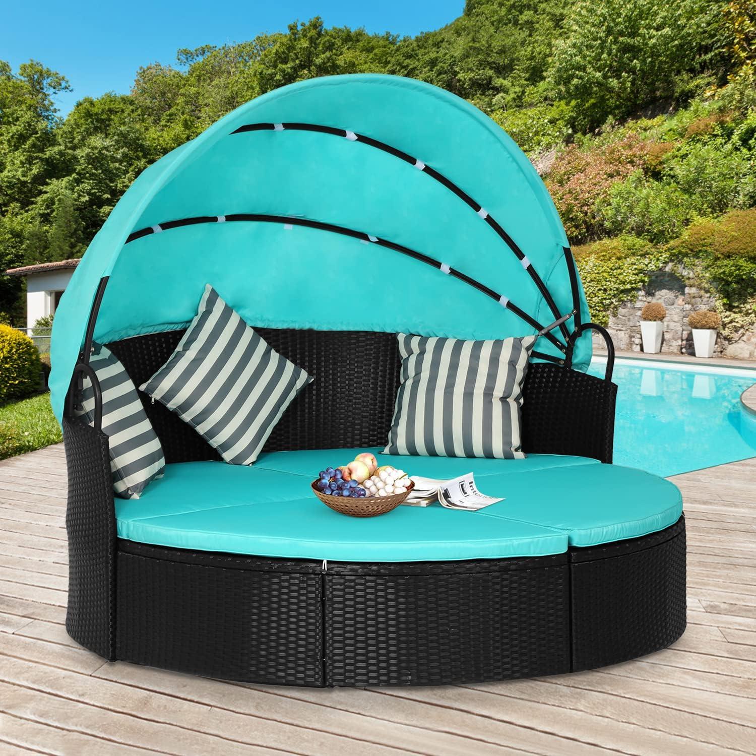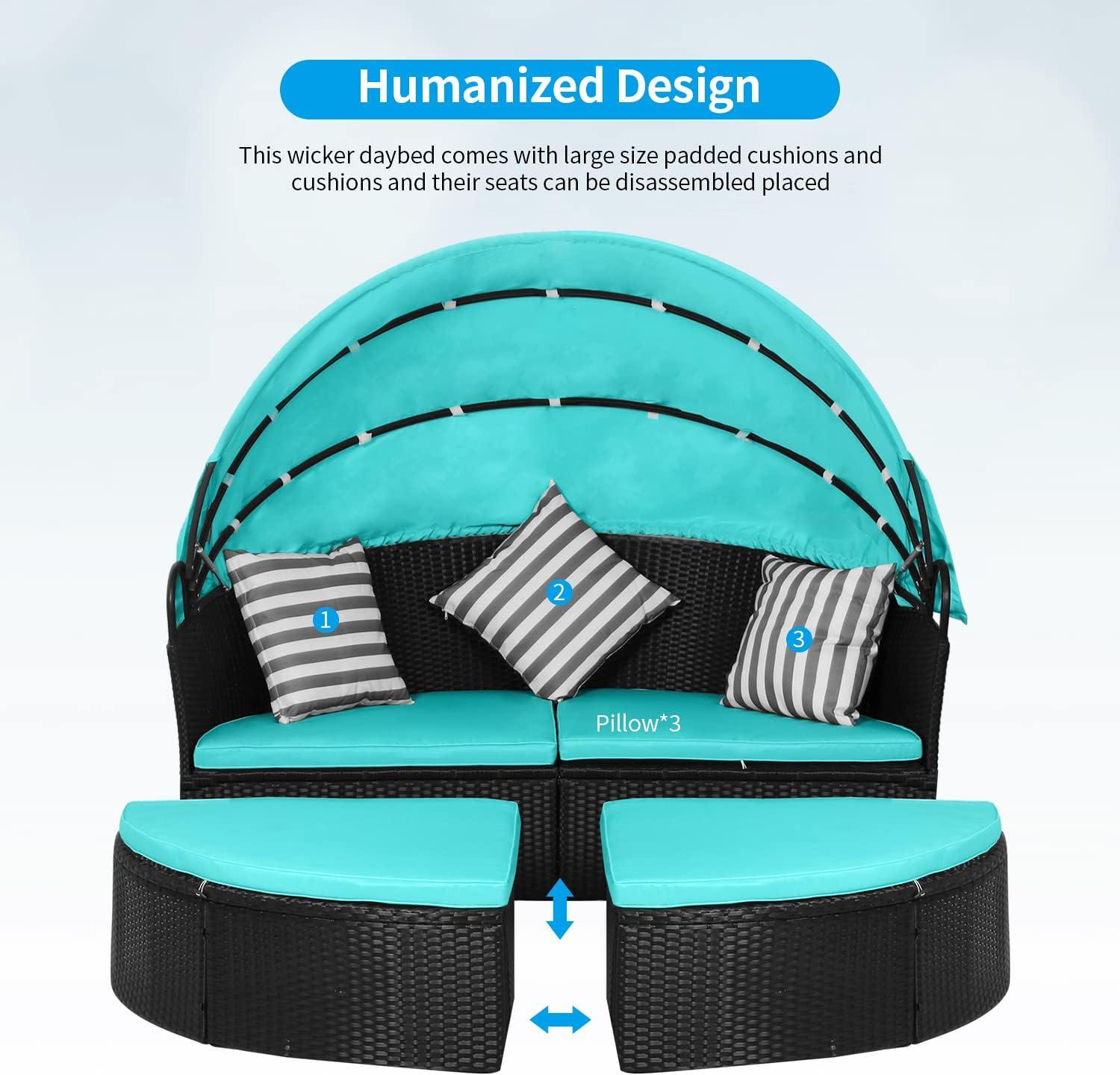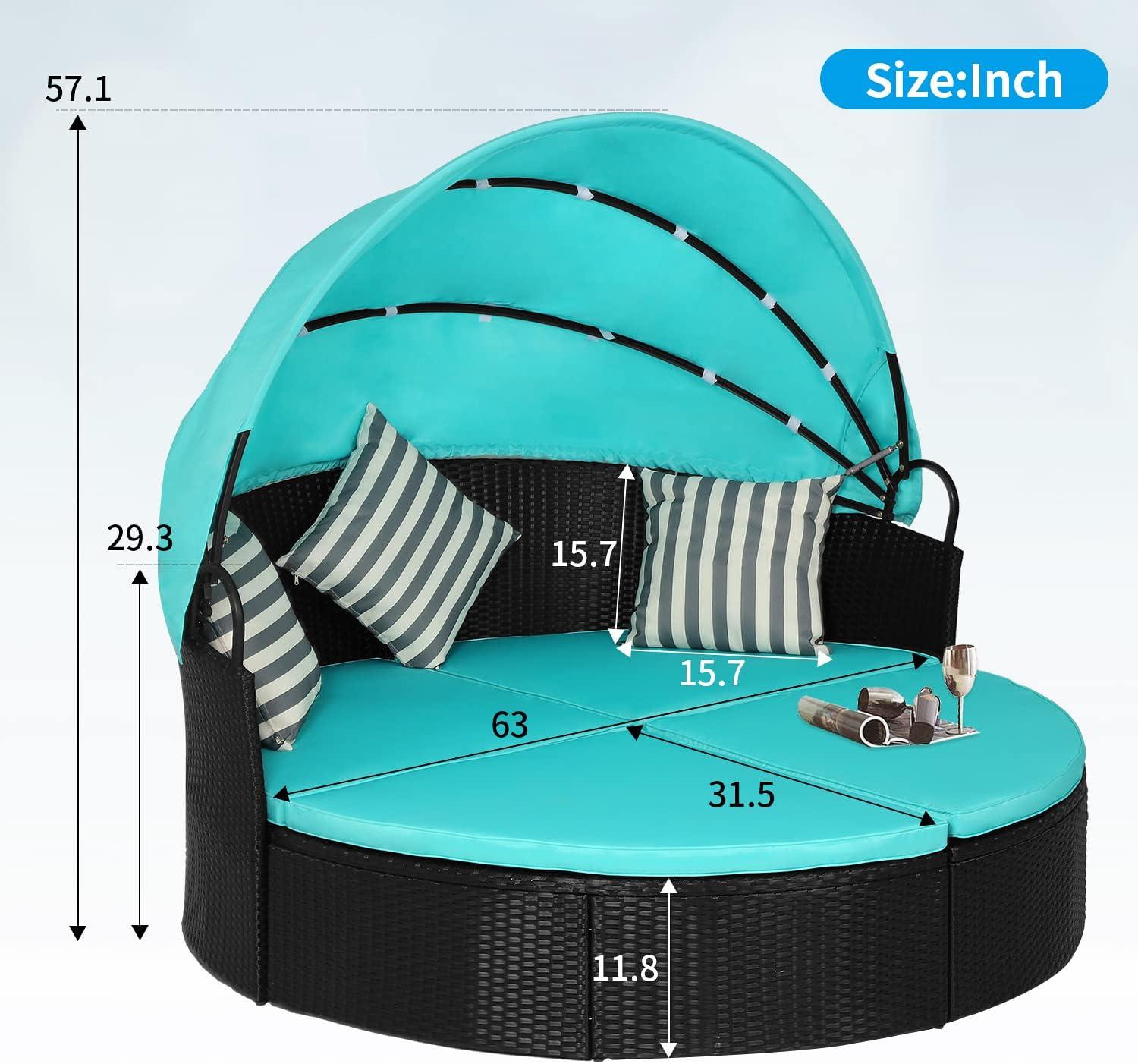 ♥【UPGRADED COMFORT】-The patio furniture set with telescopic pull rod that provide adjustable canopy. You can enjoy a sun bath in the warm sunshine when closing the canopy or enjoy a cool in the hot weather when opening the canopy.This rattan daybed comes with generous sized thick padded seat cushions and back cushions.The seat cushion of this patio round daybed can be removed for easy cleaning.