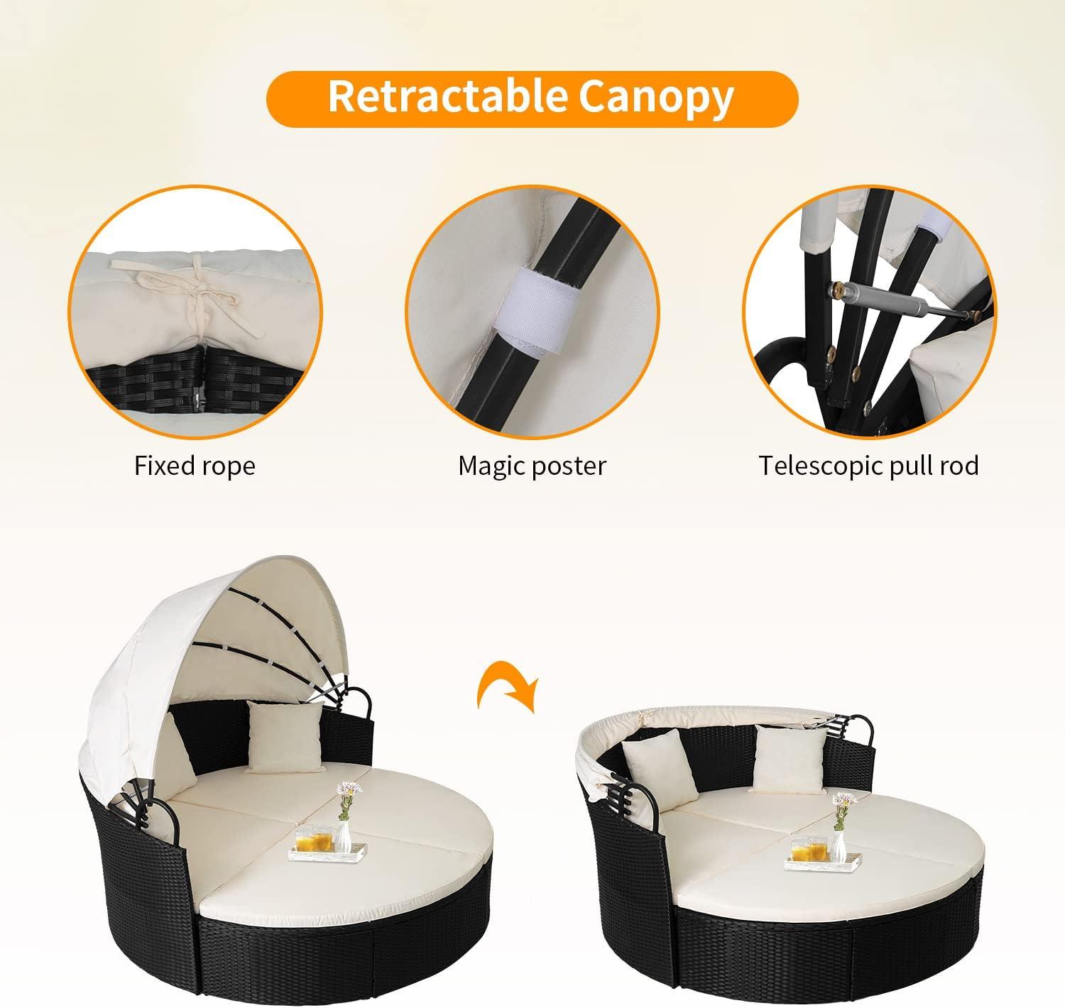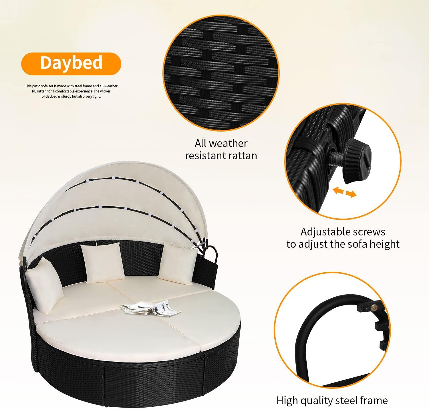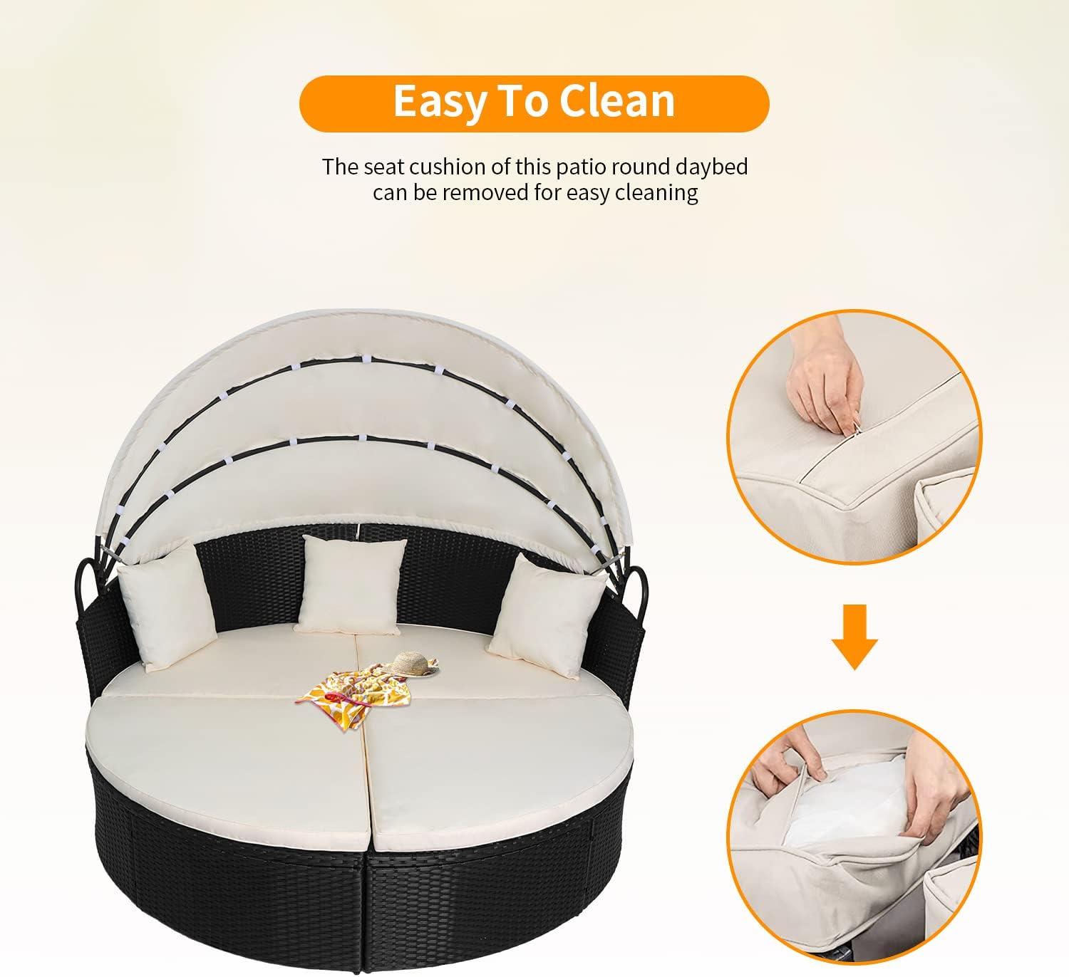 ♥【UPGRADED COMFORT】-The patio furniture set with telescopic pull rod that provide adjustable canopy. You can enjoy a sun bath in the warm sunshine when closing the canopy or enjoy a cool in the hot weather when opening the canopy.This rattan daybed comes with generous sized thick padded seat cushions and back cushions.The seat cushion of this patio round daybed can be removed for easy cleaning.