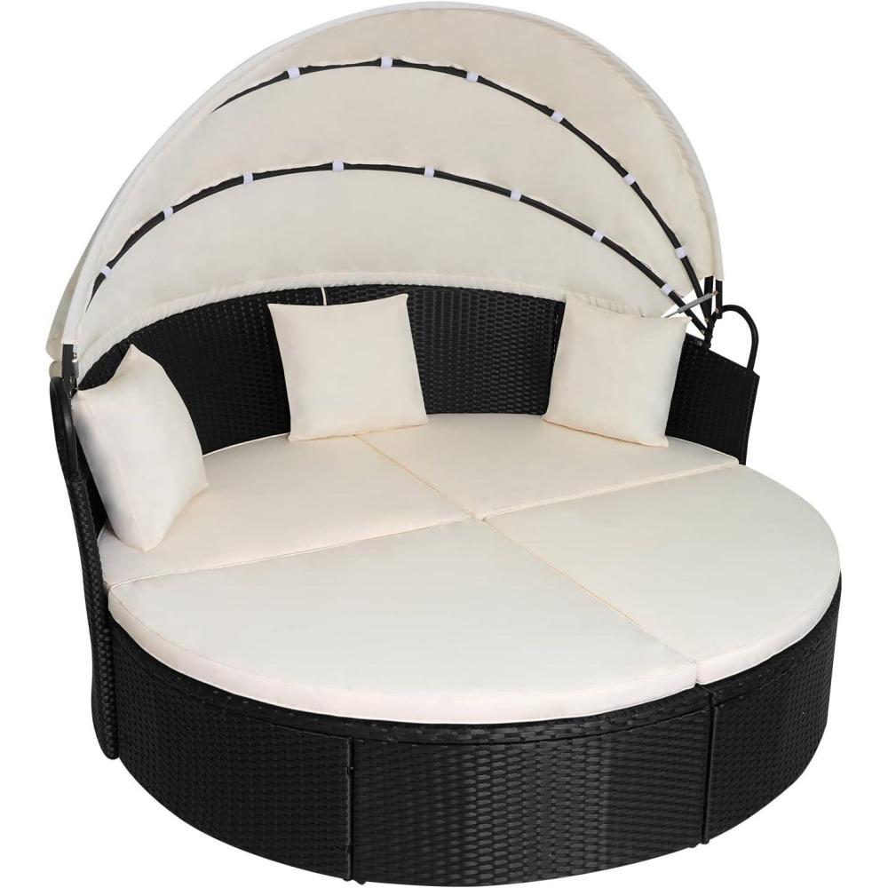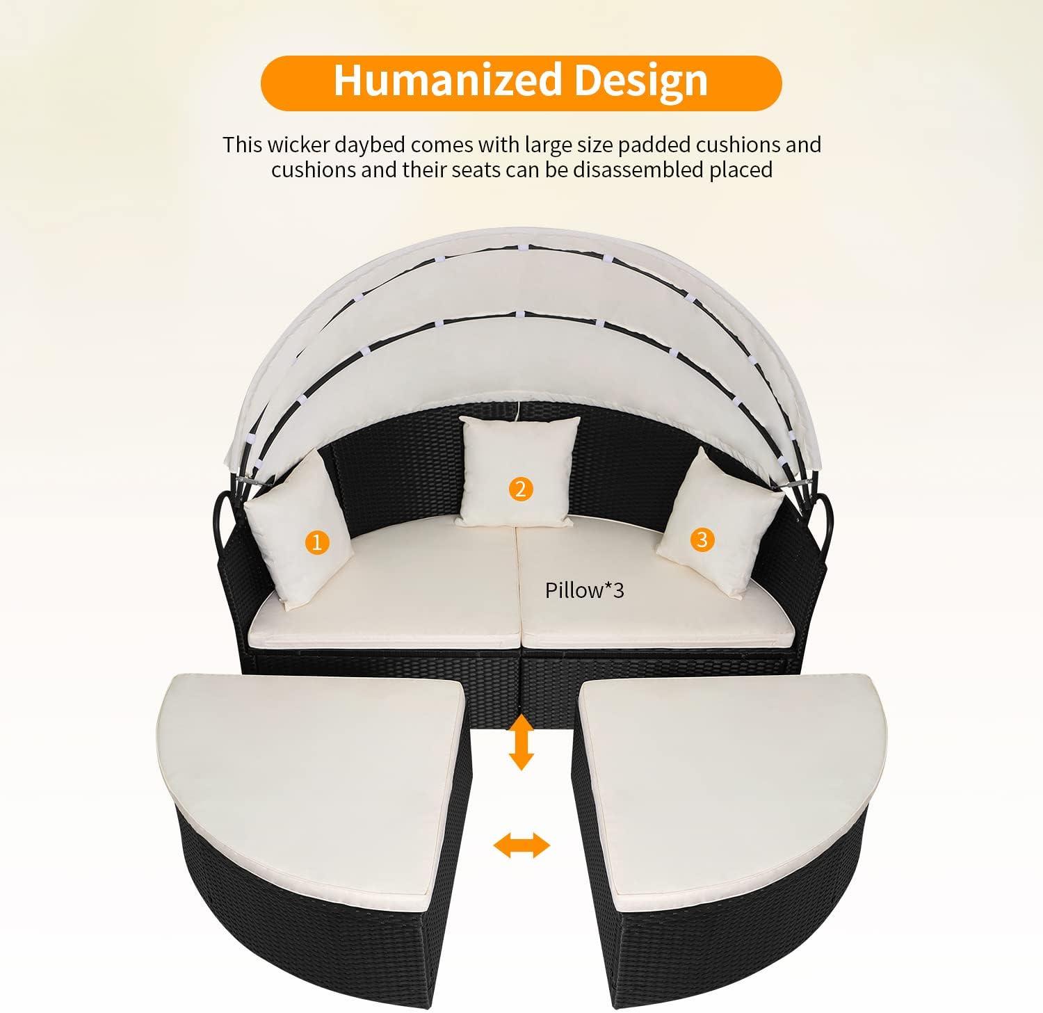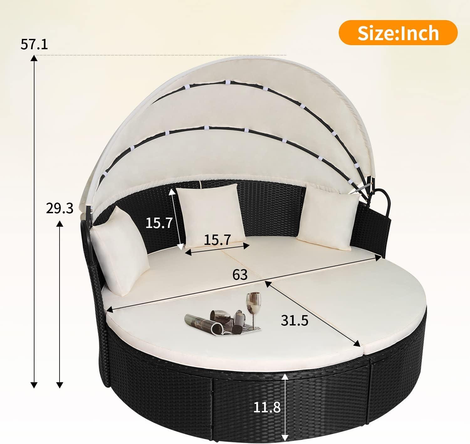 ♥【UPGRADED COMFORT】-The patio furniture set with telescopic pull rod that provide adjustable canopy. You can enjoy a sun bath in the warm sunshine when closing the canopy or enjoy a cool in the hot weather when opening the canopy.This rattan daybed comes with generous sized thick padded seat cushions and back cushions.The seat cushion of this patio round daybed can be removed for easy cleaning.