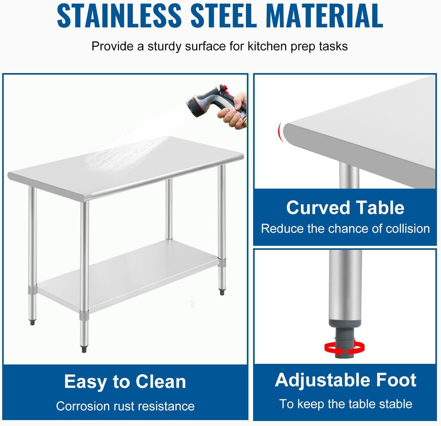 ✨High Quality Material-Our kitchen work table is made of high quality stainless steel, anti-rust, and not easy to wear and tear.Easy to clean and sterilize, Using rag or paper you can easily clean it quickly.Metal prep station tables are superior to wood or glass.